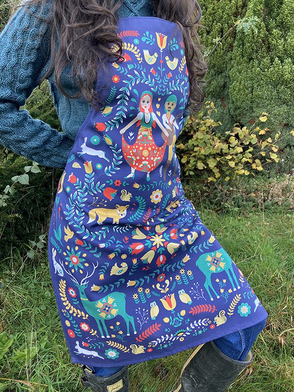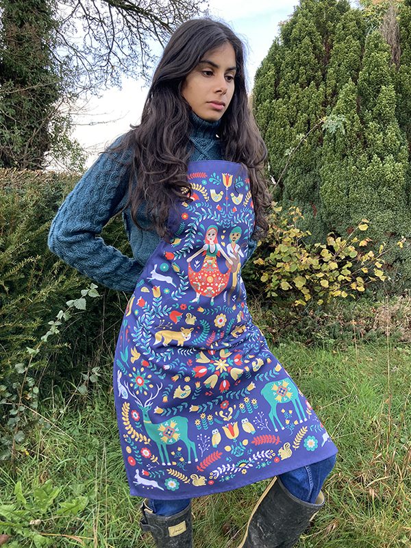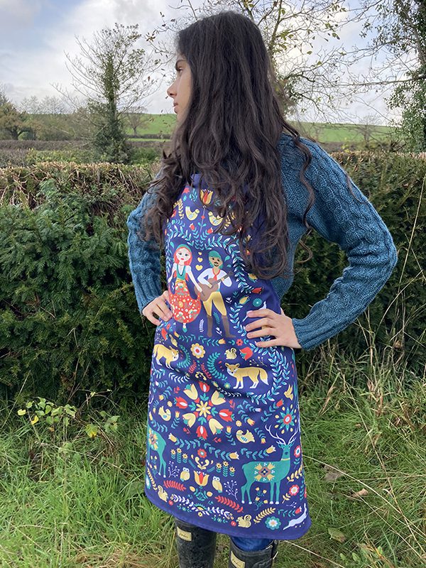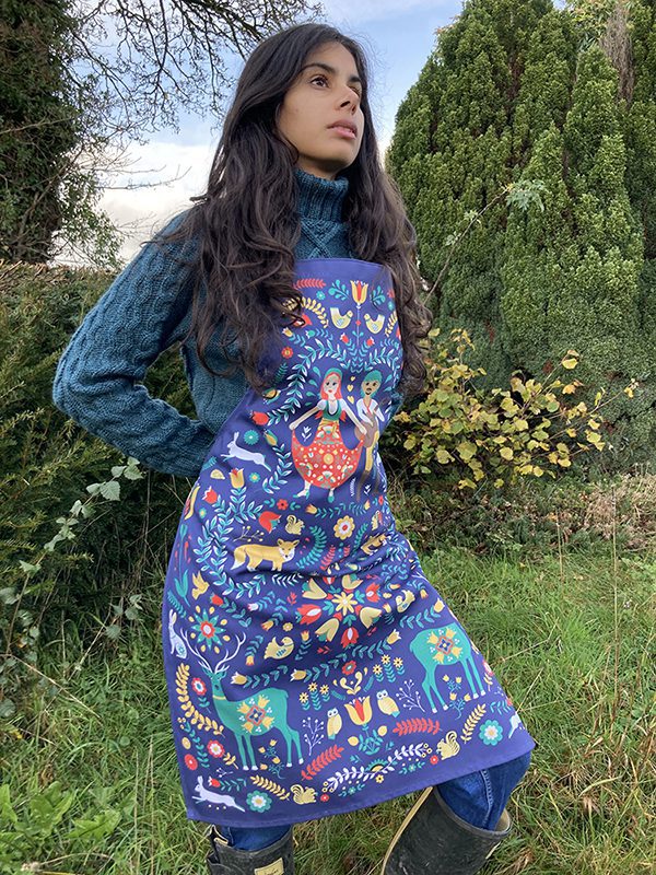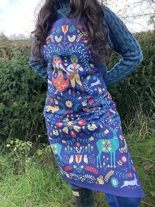 Designed and printed in the UK, this 100% cotton apron features folk art style Gypsy people with birds and other British woodland animals on a dark blue background colour