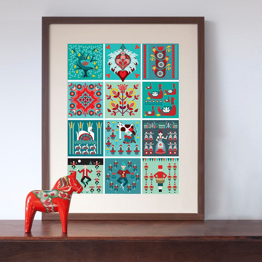 Folk / Scandinavian / Retro inspired design of 12 Days of Christmas art print, originally designed as Christmas cards, digitally printed on 200gsm silk paper.
