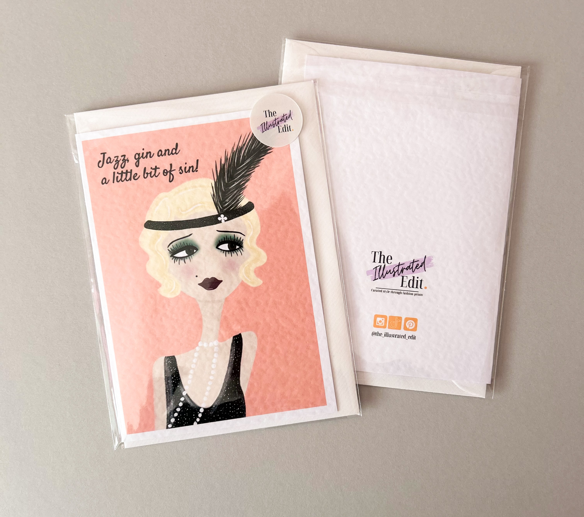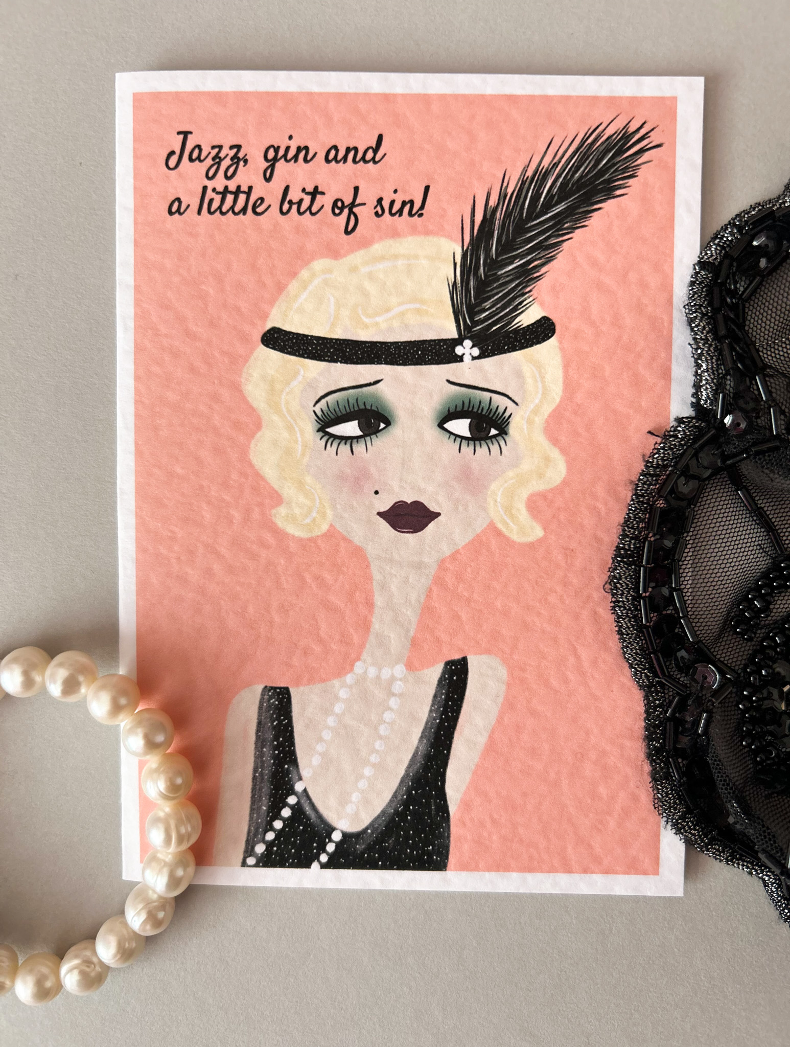 The front of the card reads: “Jazz, gin, and a little bit of sin!”—making it an ideal choice for birthdays, celebrations, or simply sending a chic and sassy note to a friend!