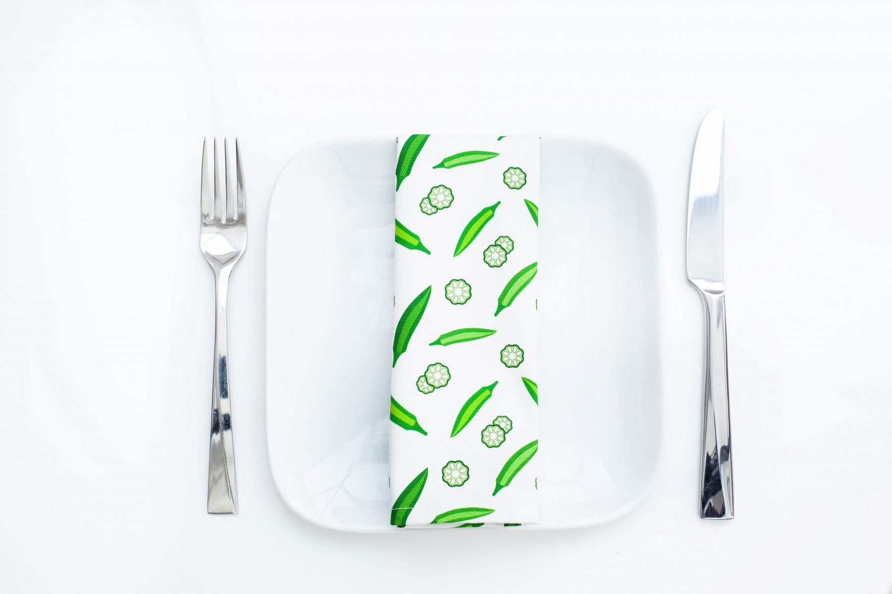 100% cotton napkins with a green and white okra design. The design features whole okra and a cross section of the distinctive vegetable.