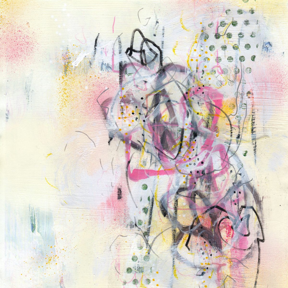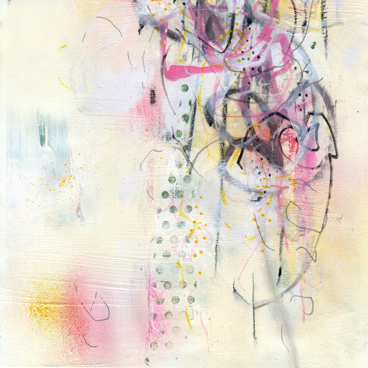 Media: This is a mixed media artwork on 167gsm printed paper and includes gesso, paint pen, graphite, coloured pencil, pastel, print transfers, thinners and spray paint.