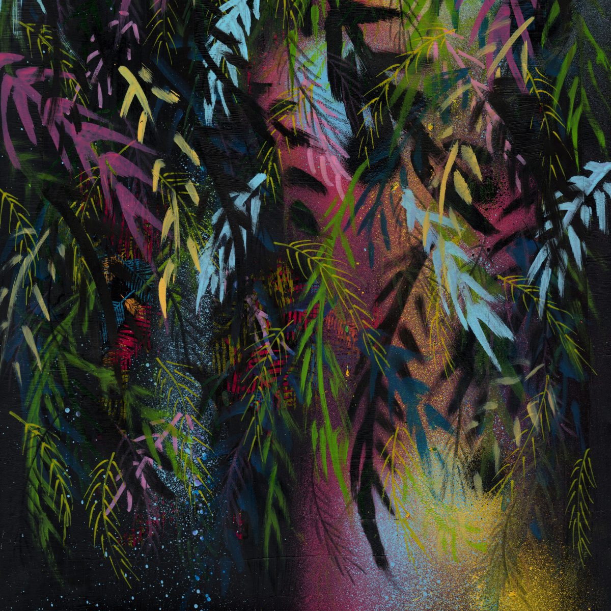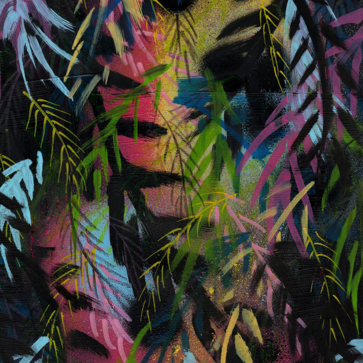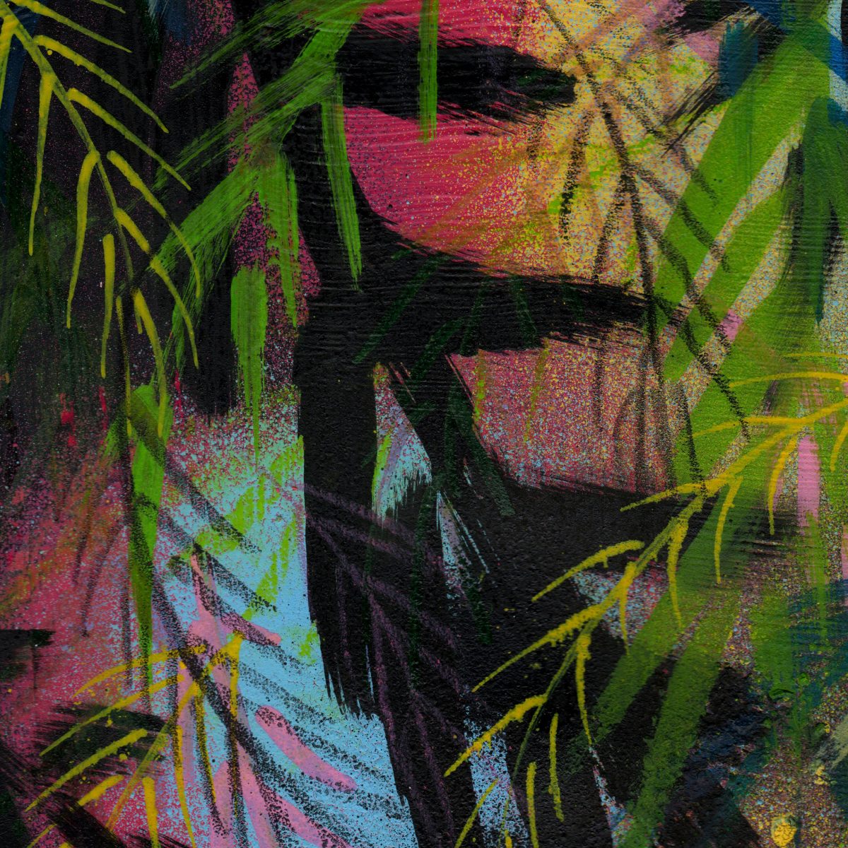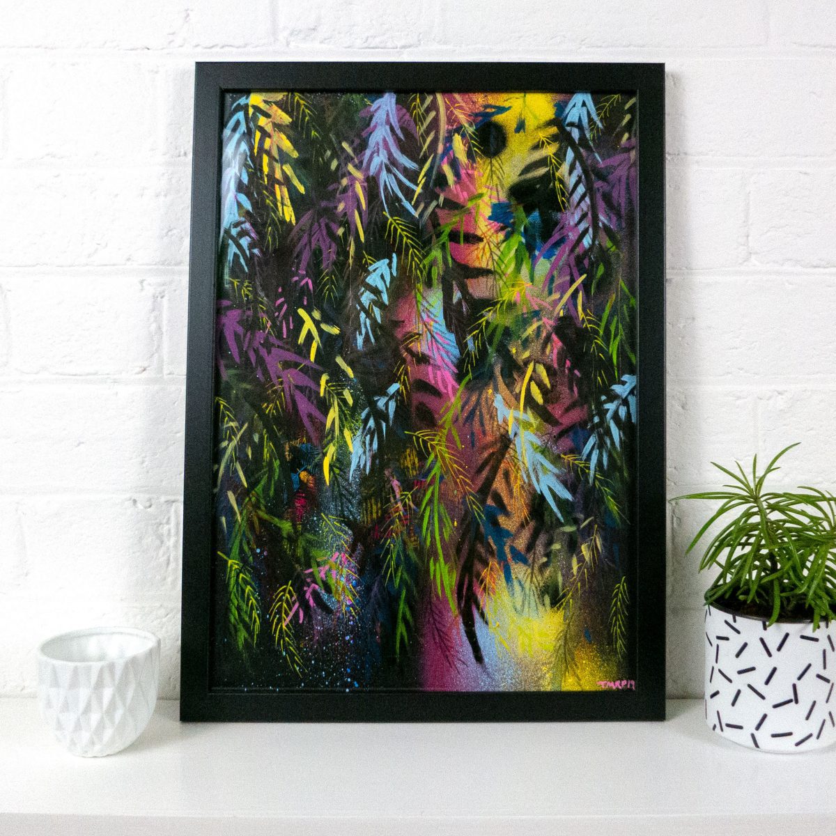 This piece is titled ‘Tropical Nights’ and is an A3 framed original artwork. The style of the work could be described as contemporary urban or street influenced art incorporating graphic elements, abstract layered marks and spray paint.