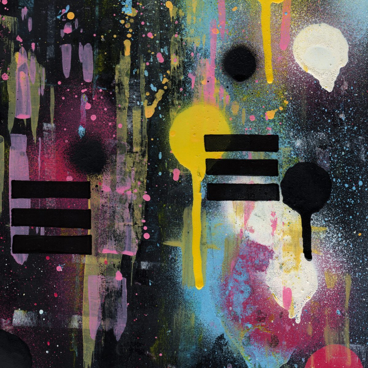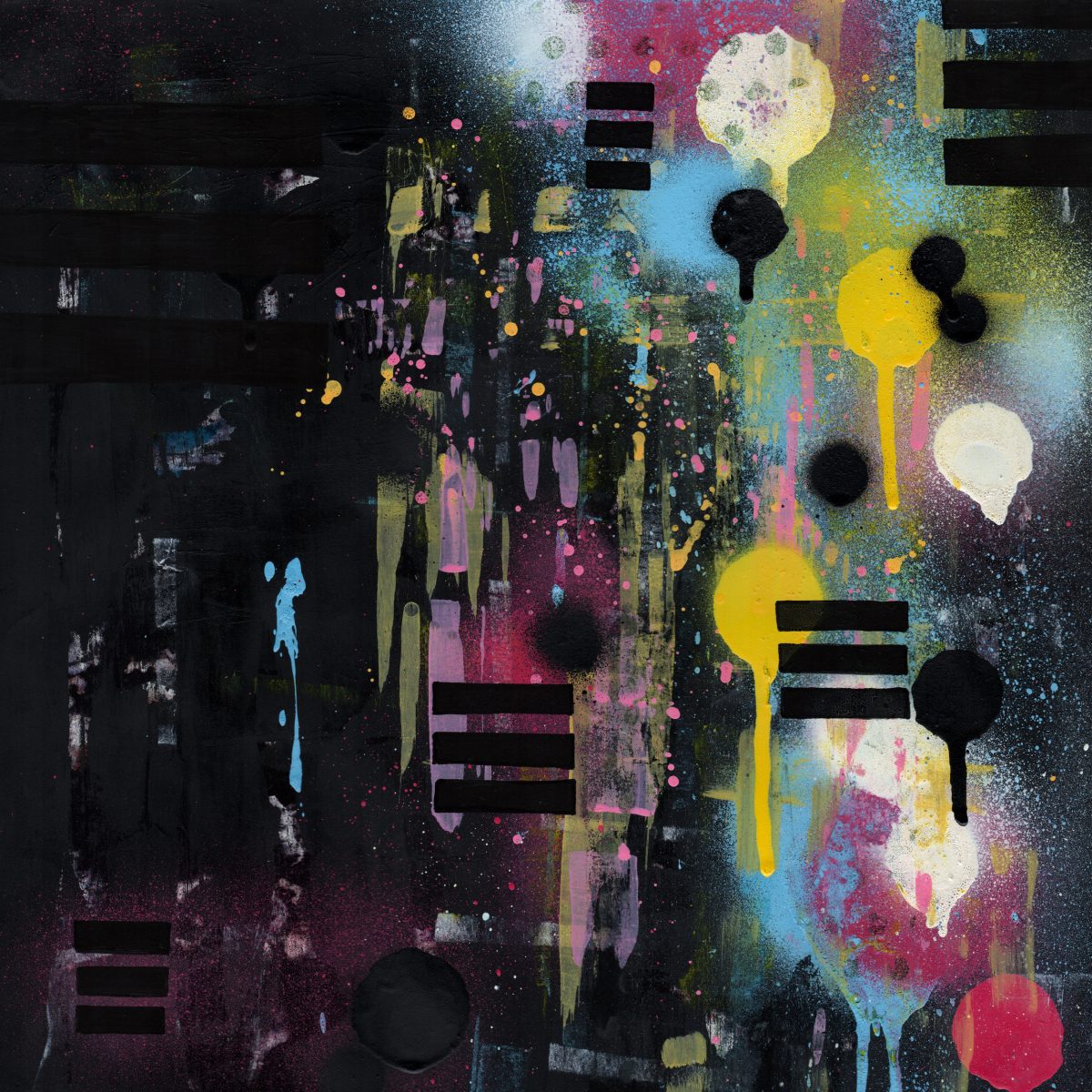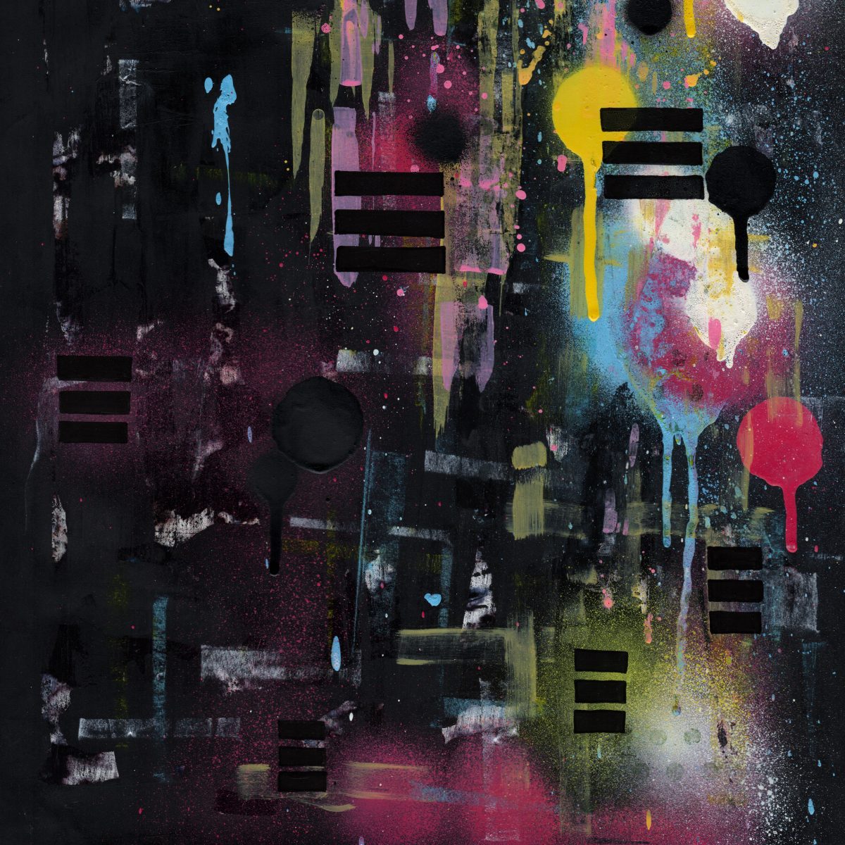 This piece is titled ‘City Lights’ and is an A3 framed original artwork. The style of the work could be described as contemporary urban or street influenced art incorporating graphic elements, abstract layered marks and spray paint.