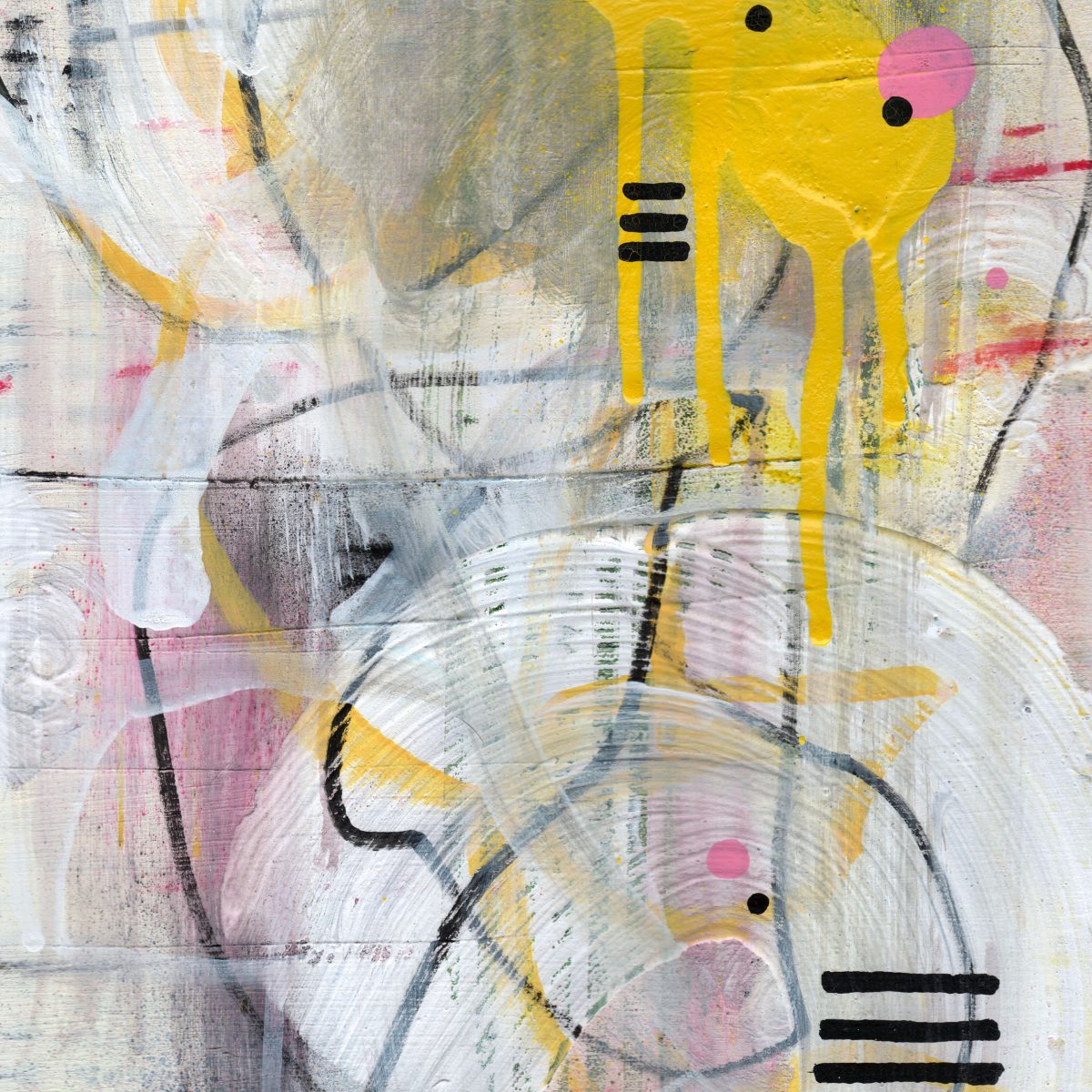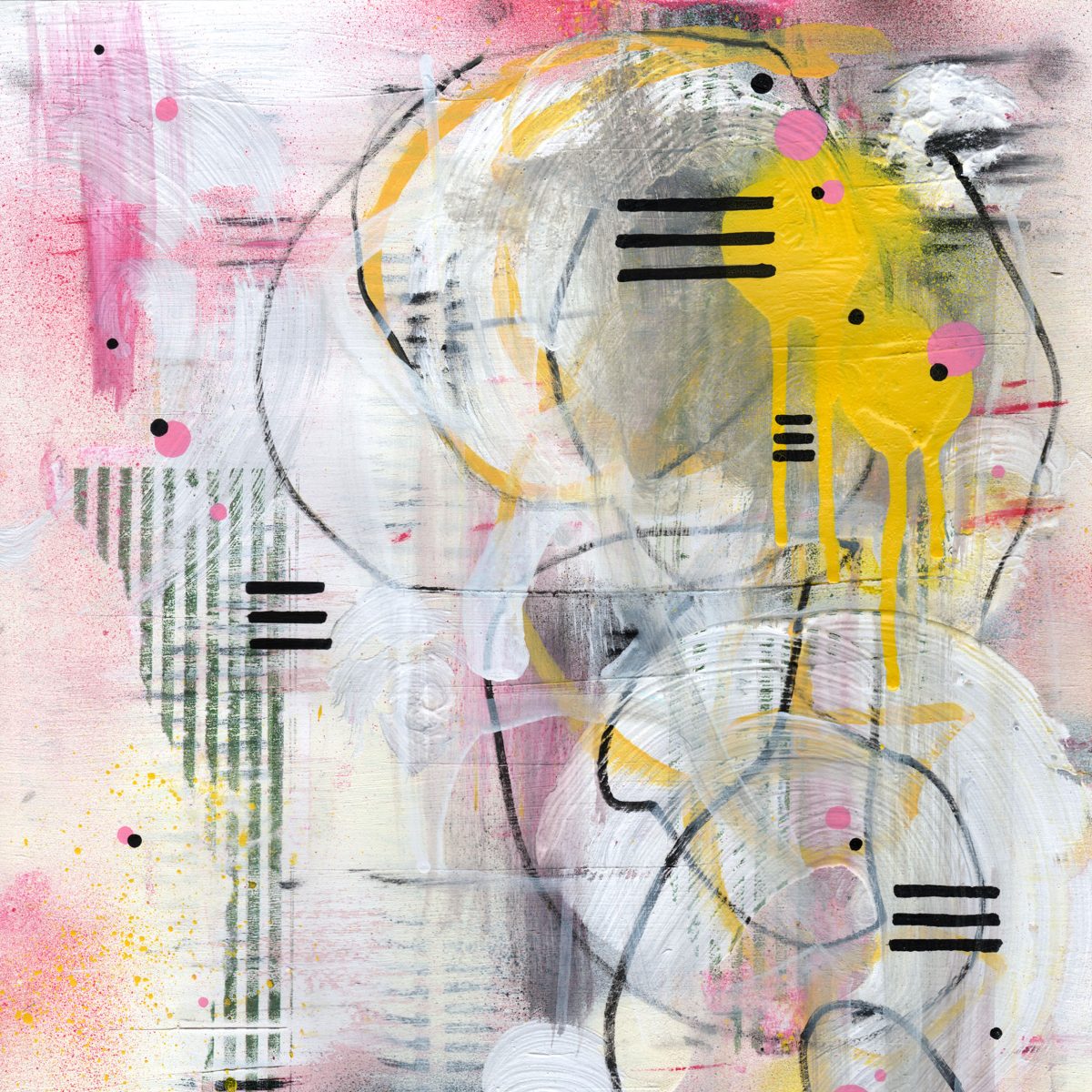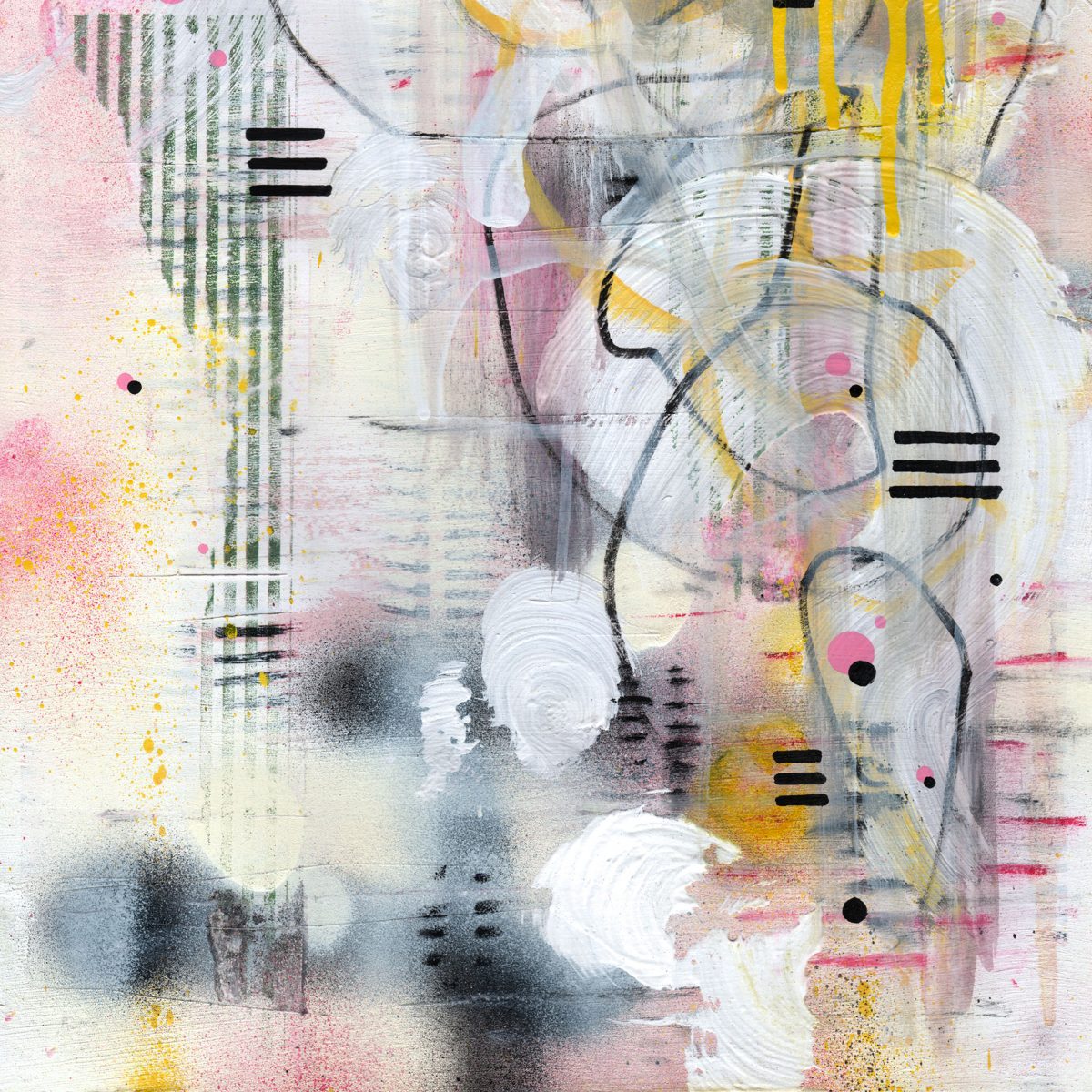 This piece is titled ‘Between the Lines’ and is an A3 framed original artwork. The style of the work could be described as contemporary urban or street influenced art incorporating graphic elements, abstract layered marks and spray paint.