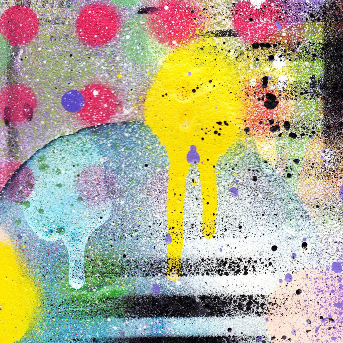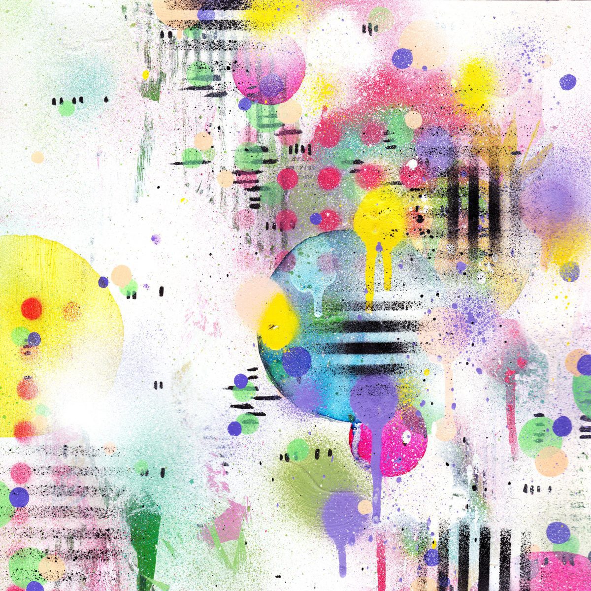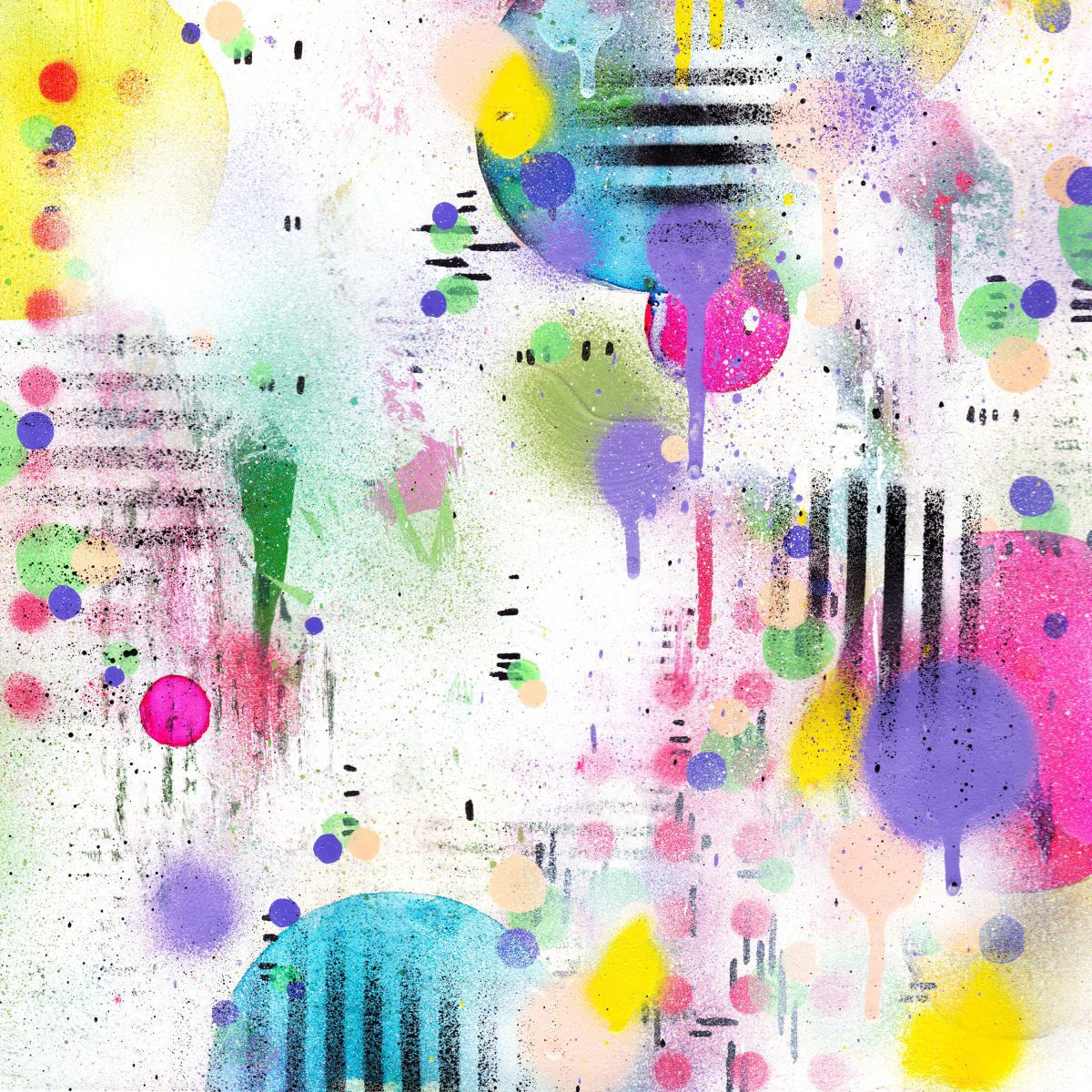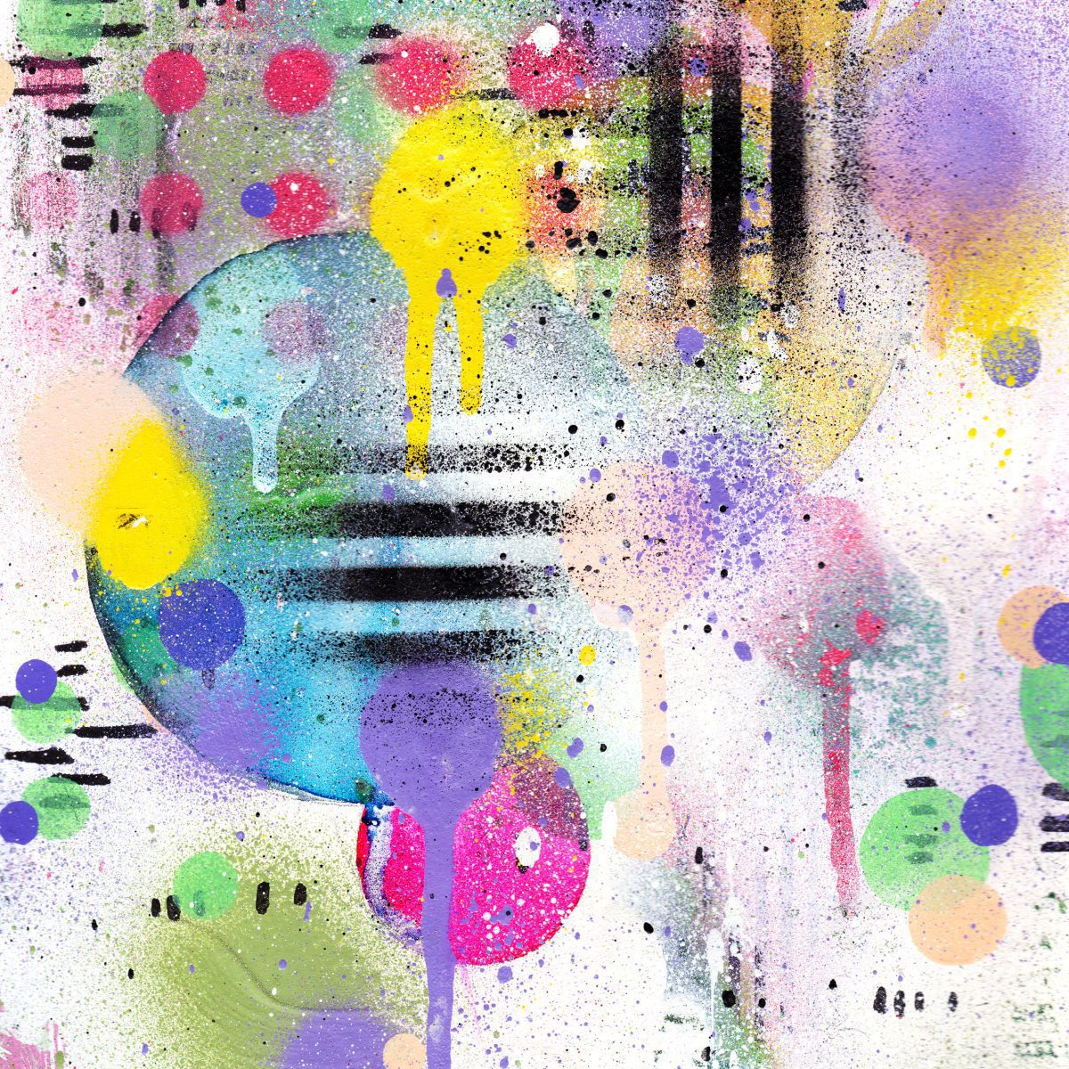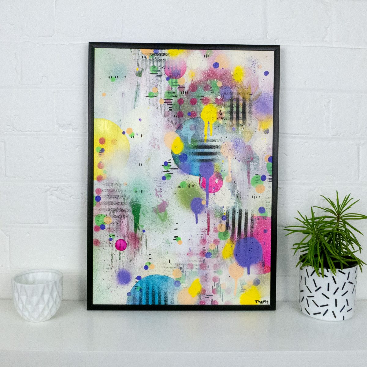 This piece is titled ‘Fairground attraction’ and is an A3 framed original artwork. The style of the work could be described as contemporary urban or street influenced art incorporating graphic elements, abstract layered marks and spray paint.