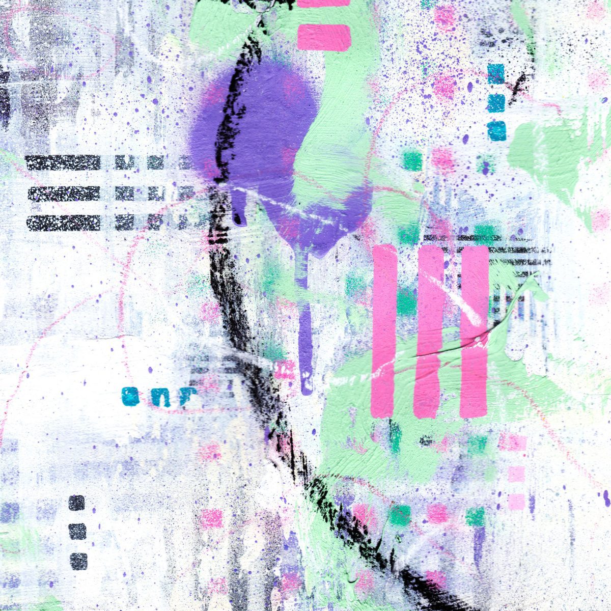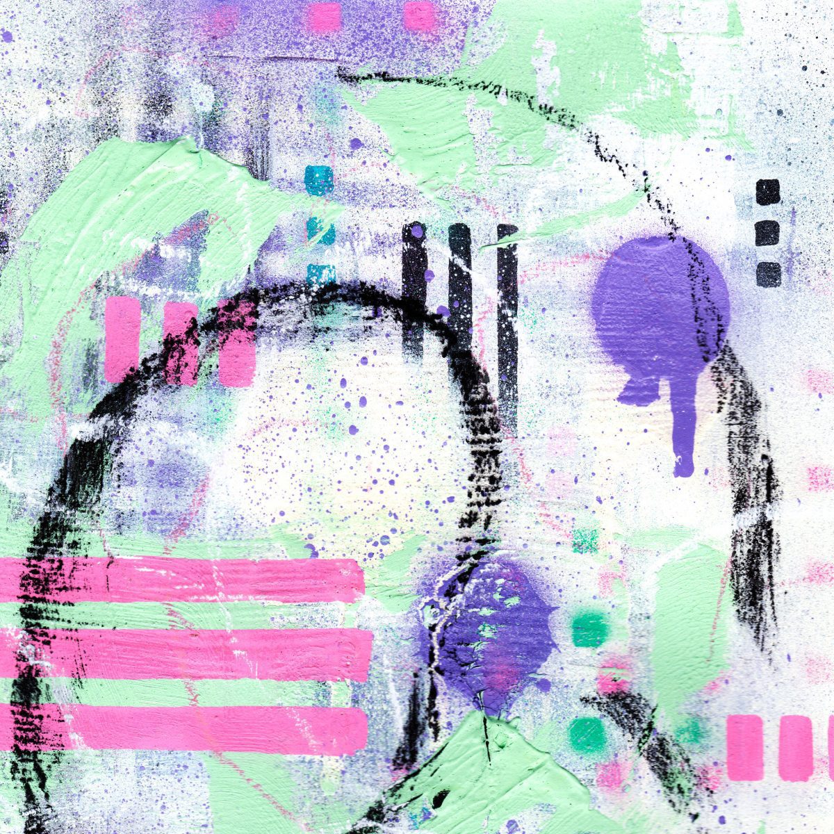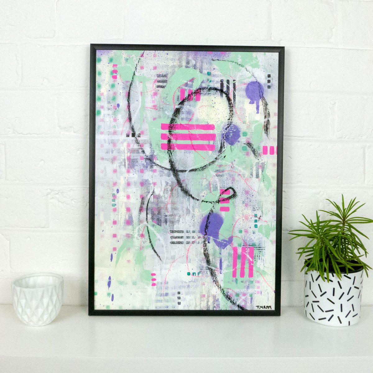 This piece is titled ‘Spring’ and is an A3 framed original artwork. The style of the work could be described as contemporary urban or street influenced art incorporating graphic elements, abstract layered marks and spray paint.