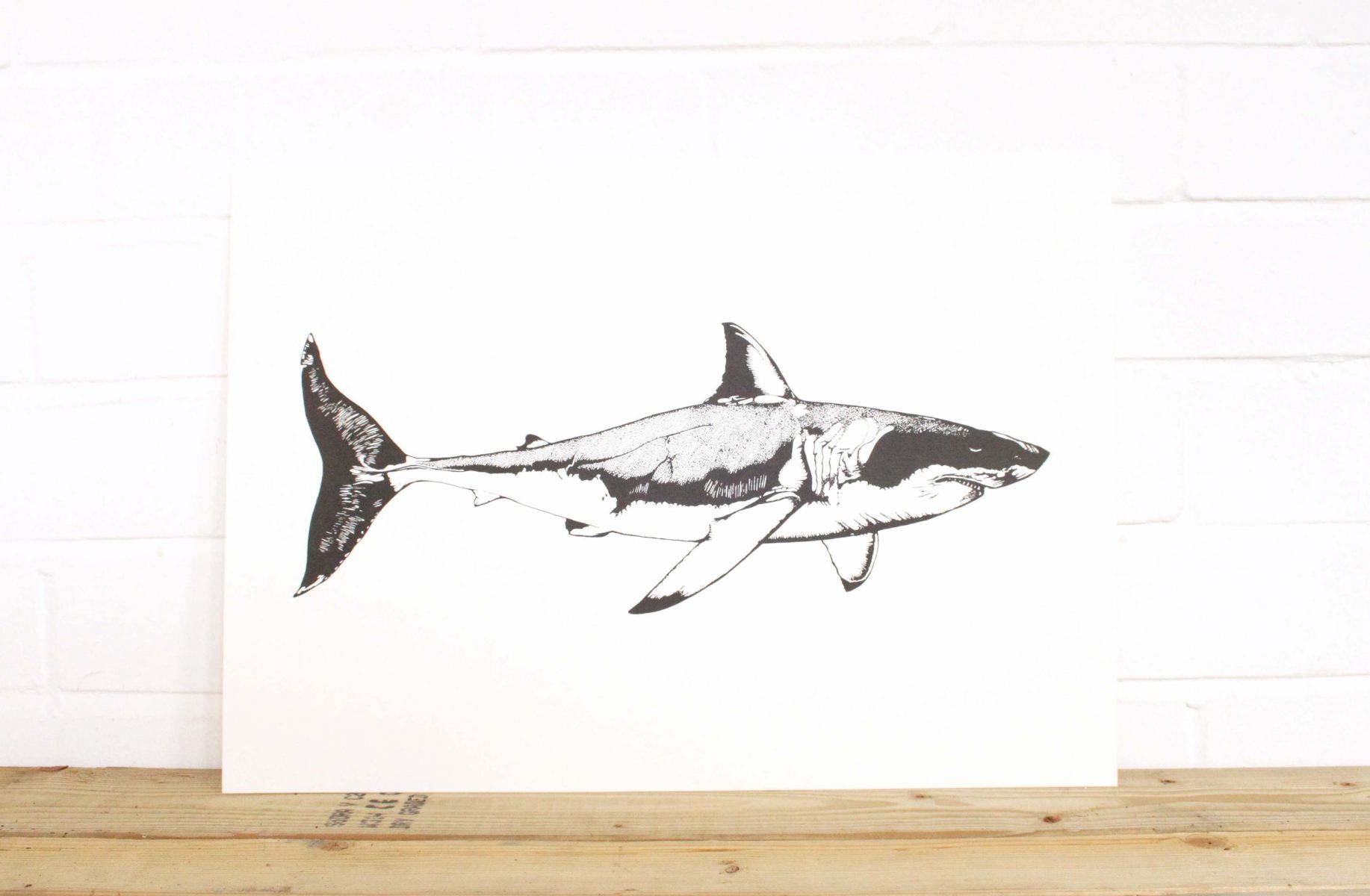 Bring the king of the sea into your home with this beautiful handmade screen print of a great white shark.