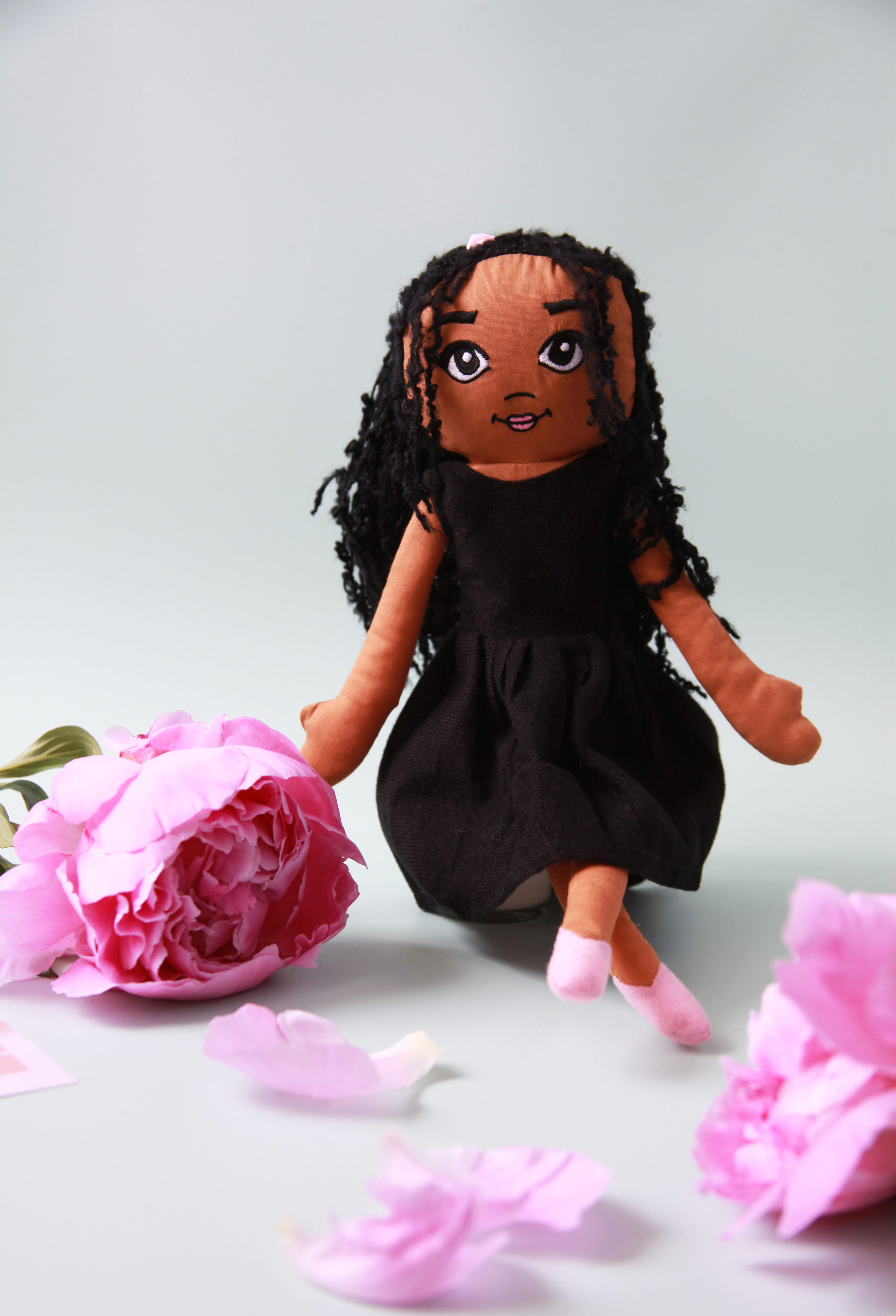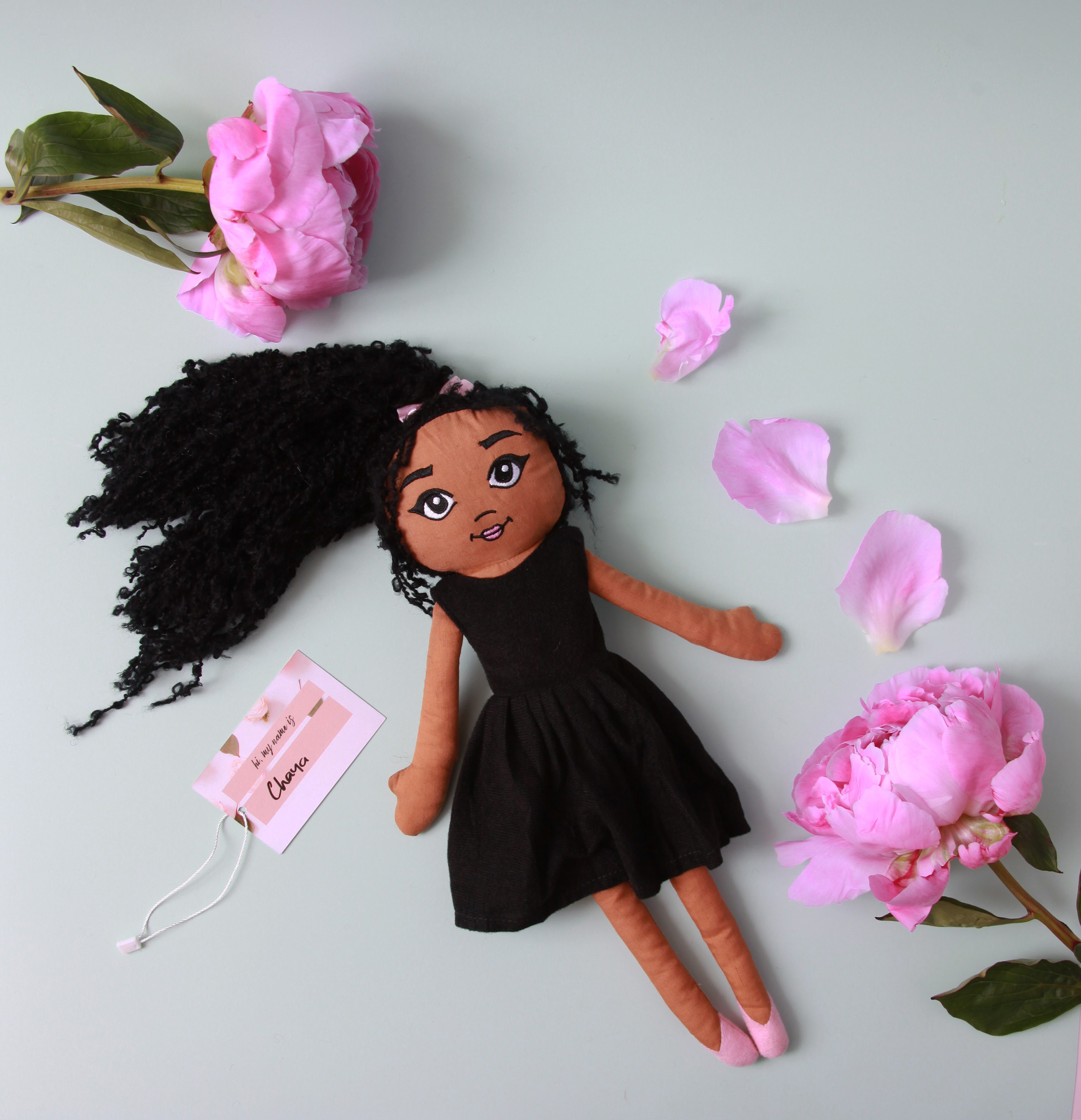 Chaya doll, is of mixed heritage, and is wearing her LBD, with statement pink shoes and a pink bow in her hair. Her hair is made of soft yarn, in a pony tail, that is meant for styling. The doll comes with hair already in set hairstyle up until the bow, and is suitable for gentle play.
