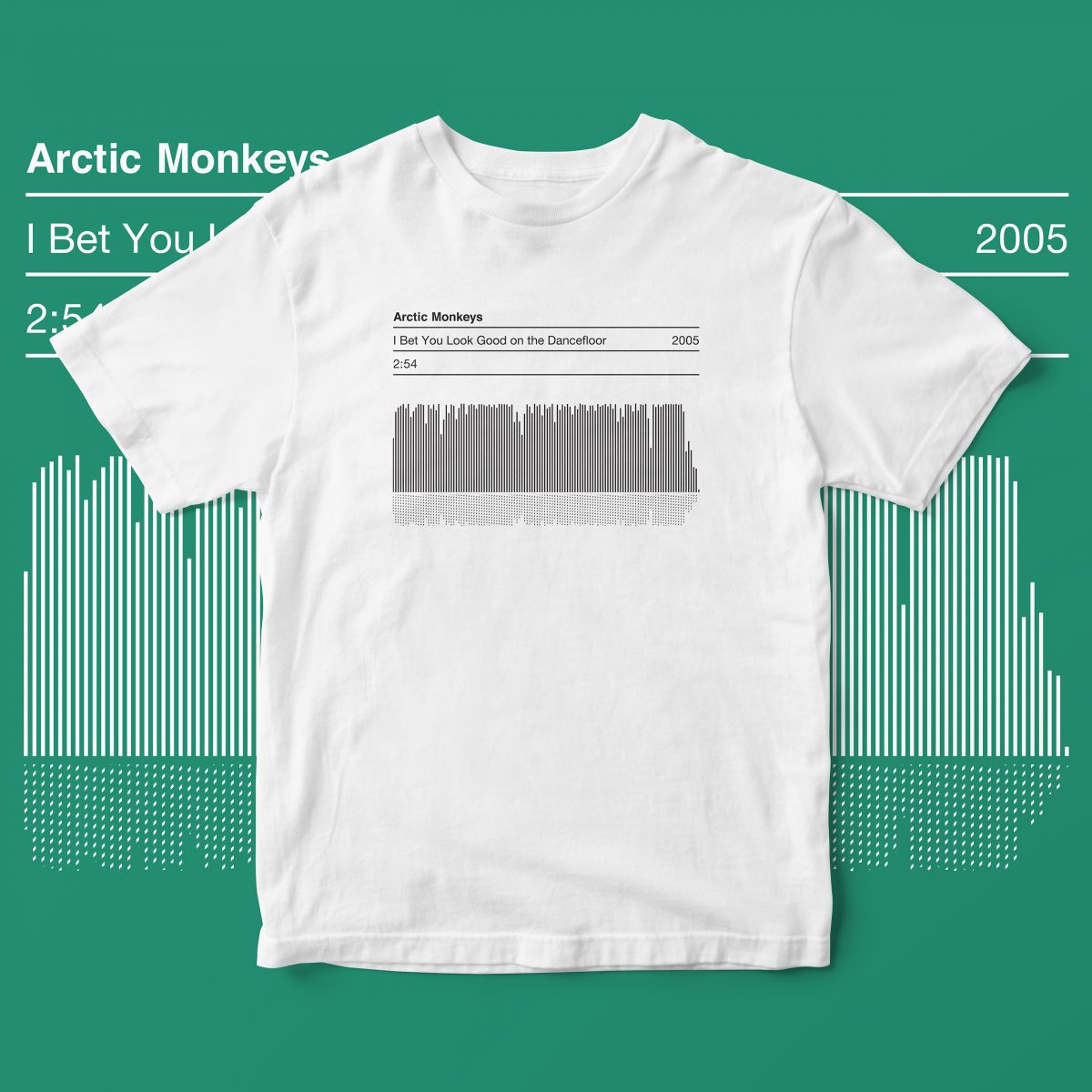 This a hand screen printed crew neck T-shirt featuring an original Serigrafica7585 design. The T-shirt displays the graphic sound wave and vital information, including the song length and date of release of the classic UK indie No 1 hit, ‘I Bet You Look Good on the Dance floor’, by Brit Indie band Arctic Monkeys.