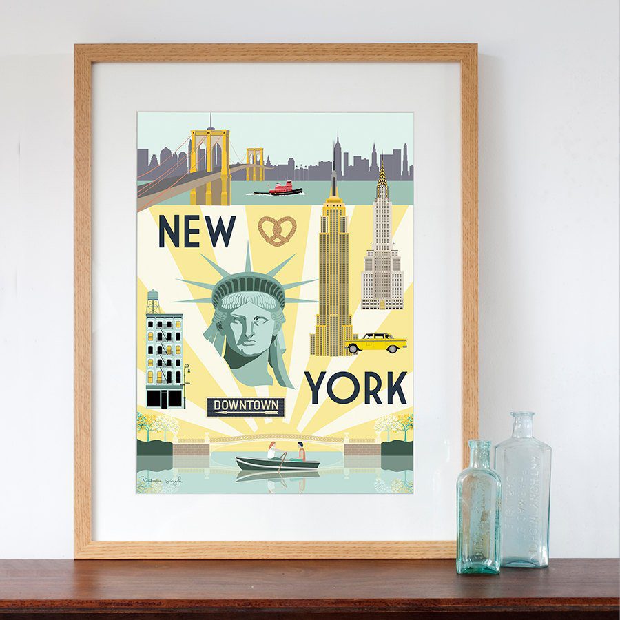 Inspired by retro travel posters, this colourful art print of New York City features famous landmarks around New York City such as the Empire State Building, Chrysler Building, Statue of Liberty and the Brooklyn Bridge.