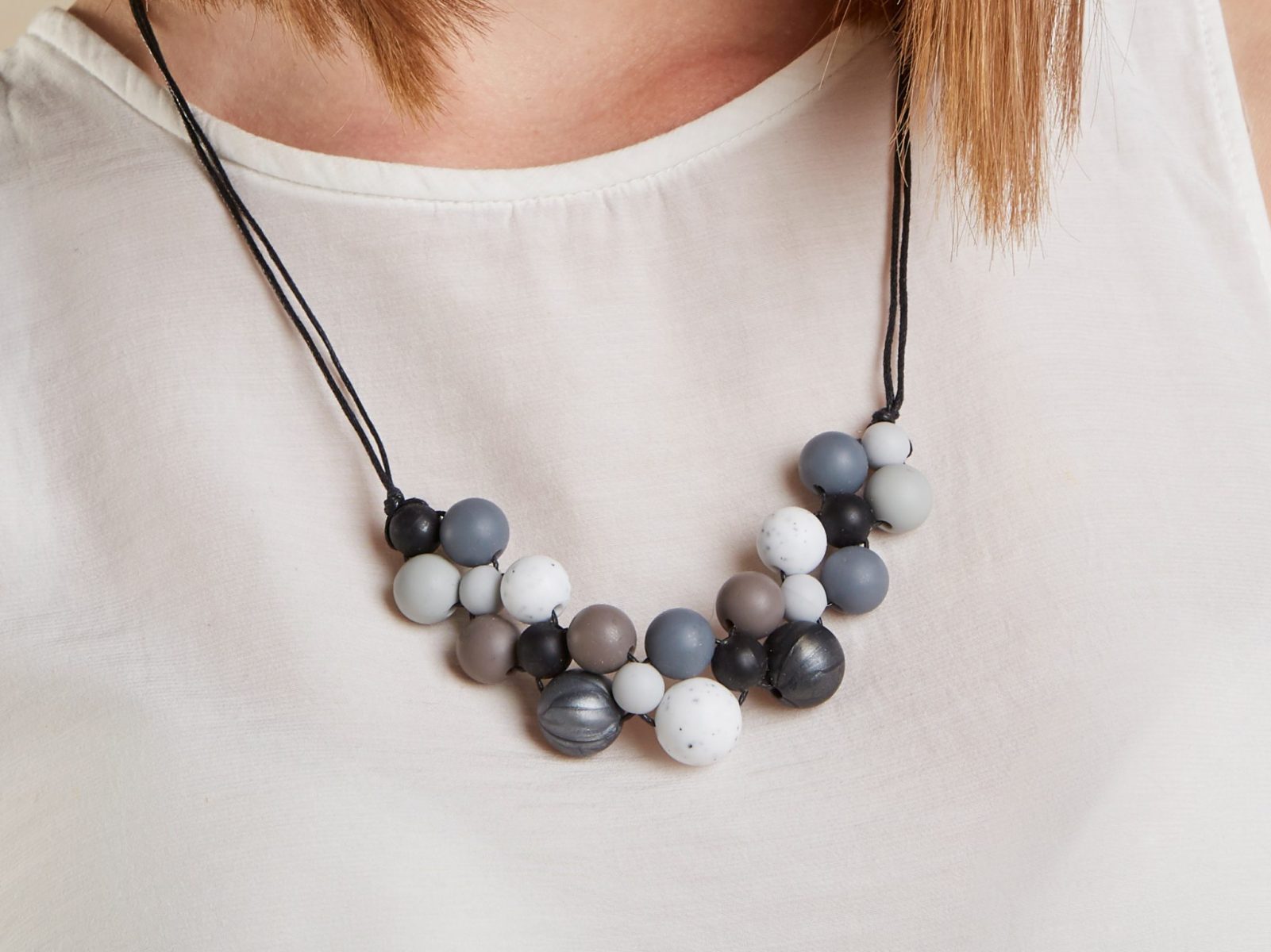 These modern, geometric Granite Silicone Necklaceare handmade using silicone beads and waxed cotton, making them the perfect statement necklace and the ideal gift for her. Bold and brightly coloured, these chunky bead necklaces make beautiful statement pieces while also being lightweight and comfortable to wear.