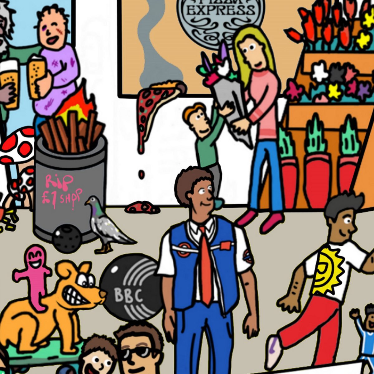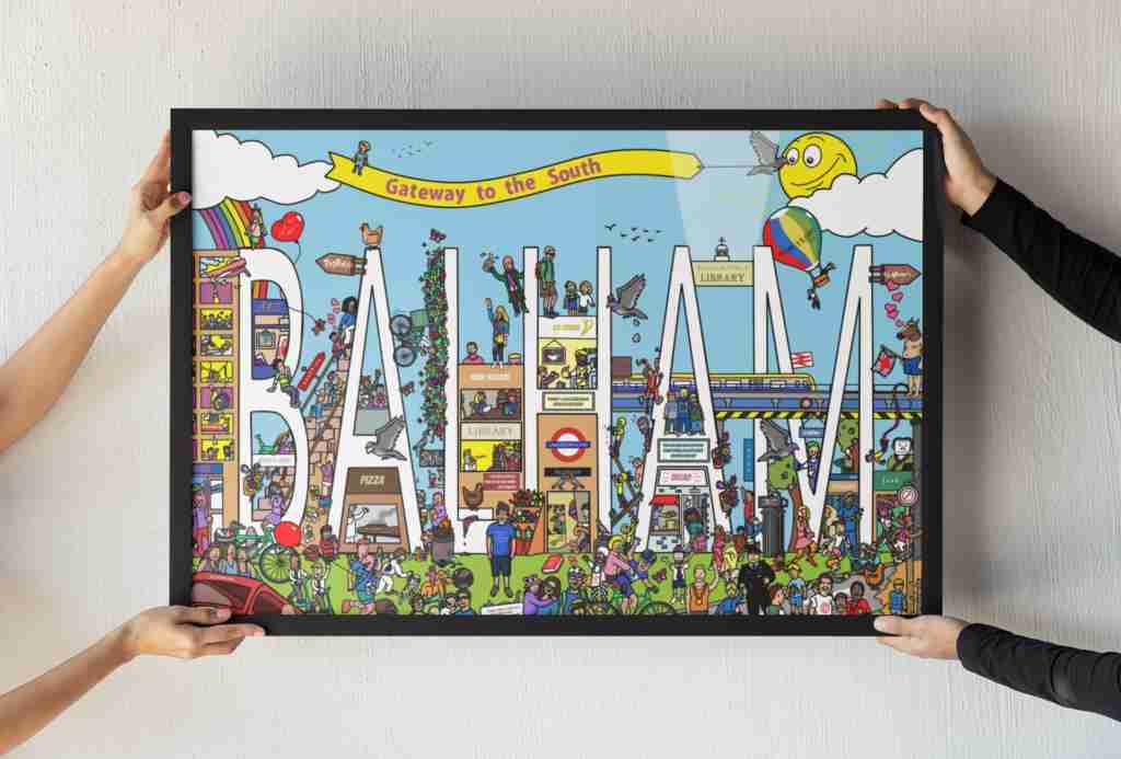 Welcome to Balham! It was once known as the Gateway to the South. Hence the banner across the top of the banner. There are many local businesses within this artwork including