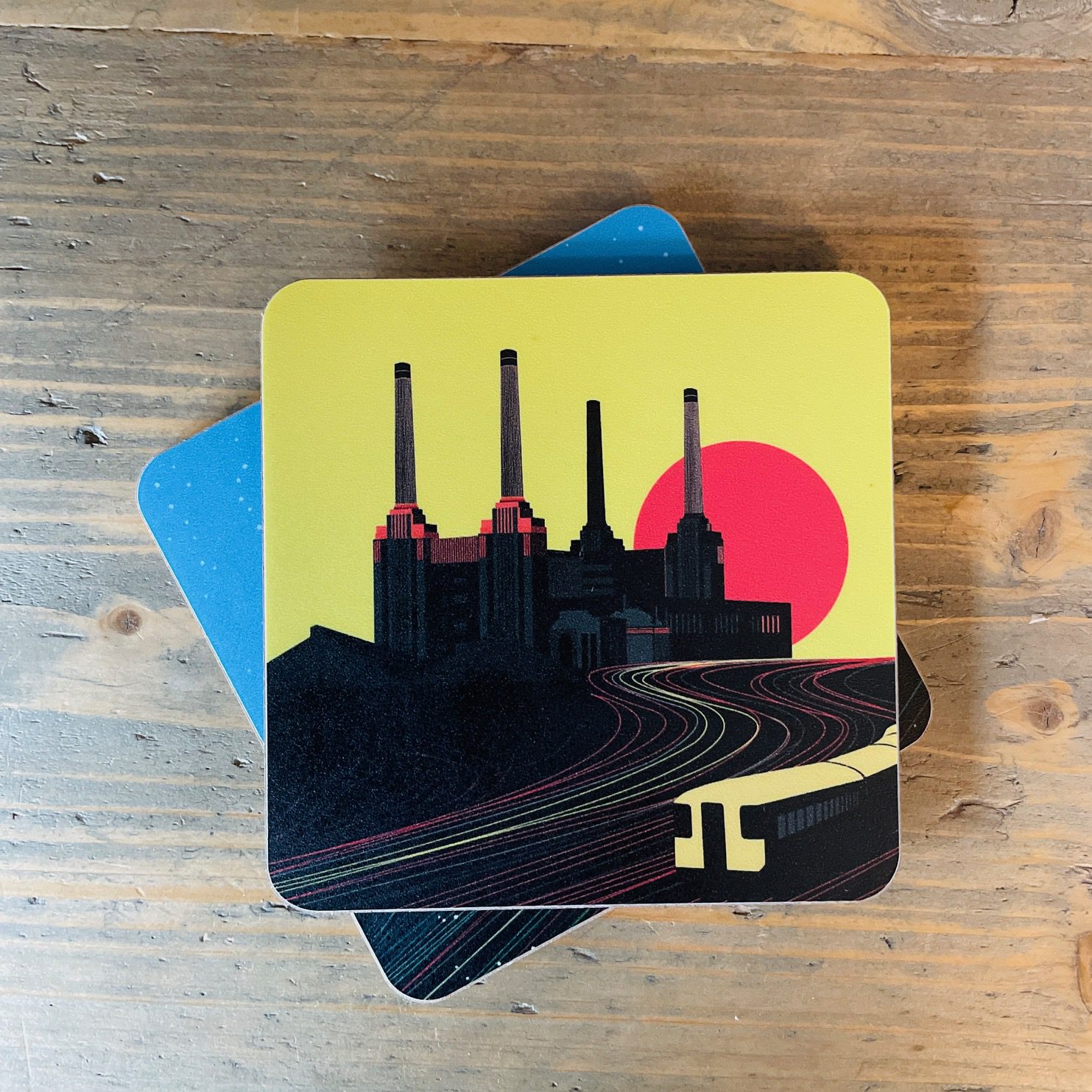 Battersea London Coaster Pair. Set of 2 coasters featuring the Battersea Power Station. Battersea Sunset and Battersea Winters.