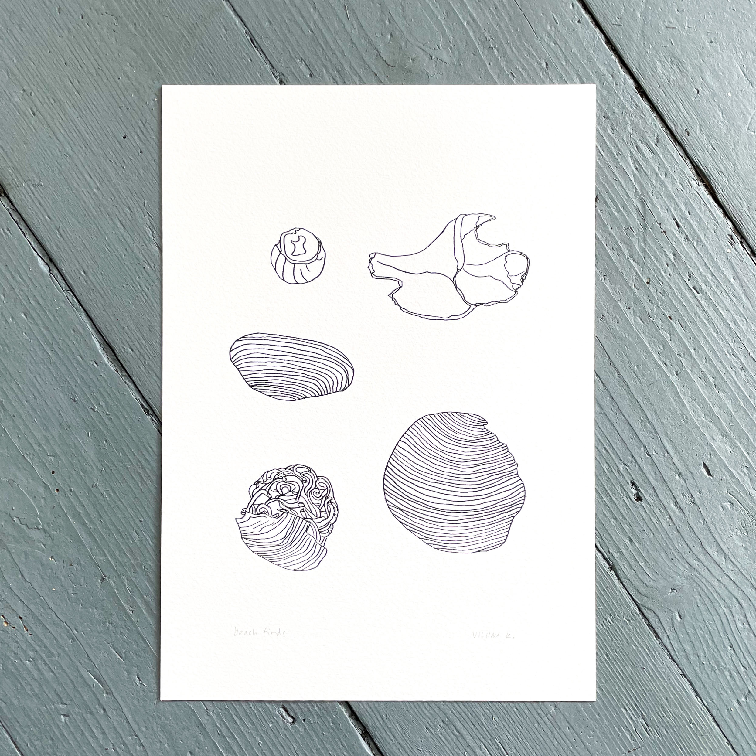 The prints are produced with archival-quality pigment inks on premium textured paper, ensuring long-lasting quality to the original hand-drawn beach finds.