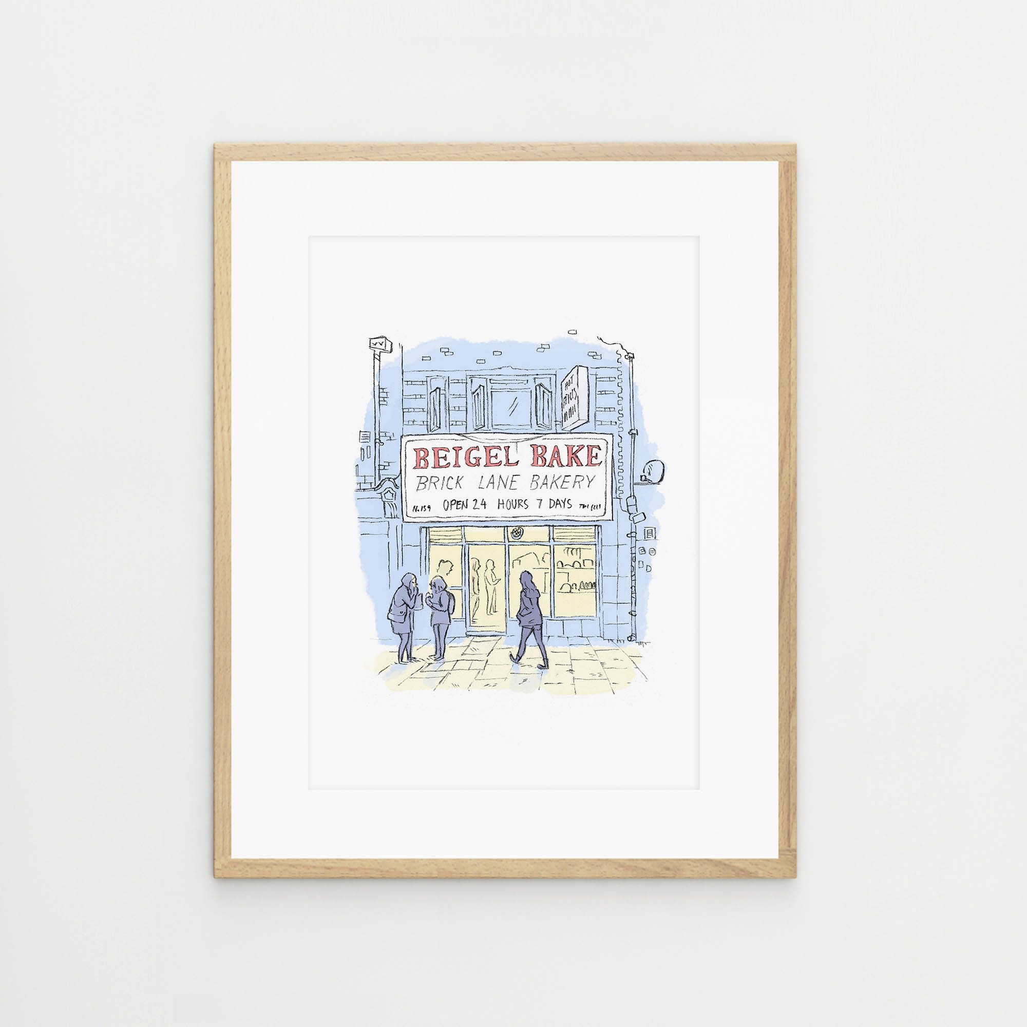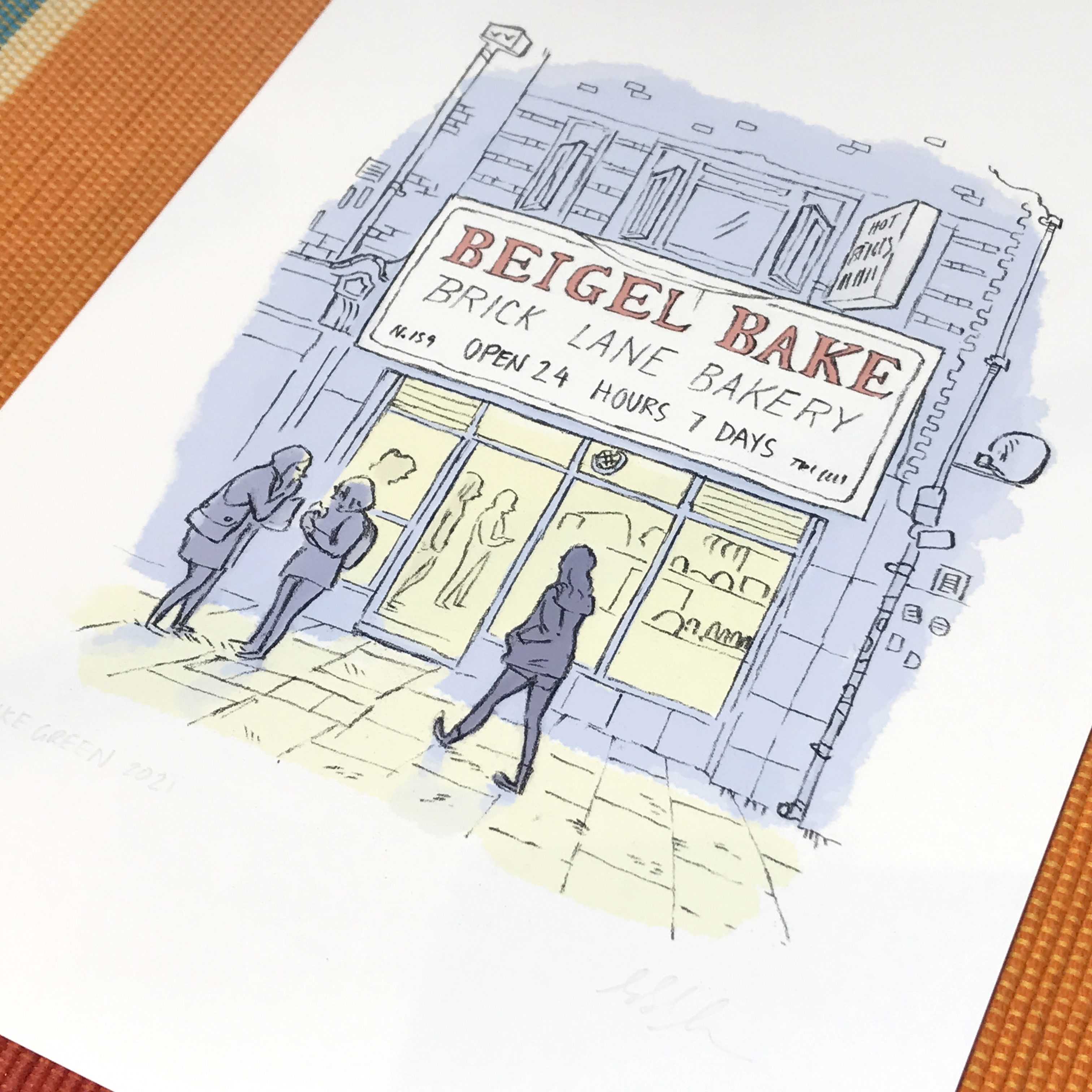 A signed print of the famous Beigel Bake Brick Lane Bakery on Brick Ln in Shoreditch London. Established in 1974 this shop has become a bit of a local institution and has even had royal visitors. Most importantly they make very tasty beigels 24/7 🙂