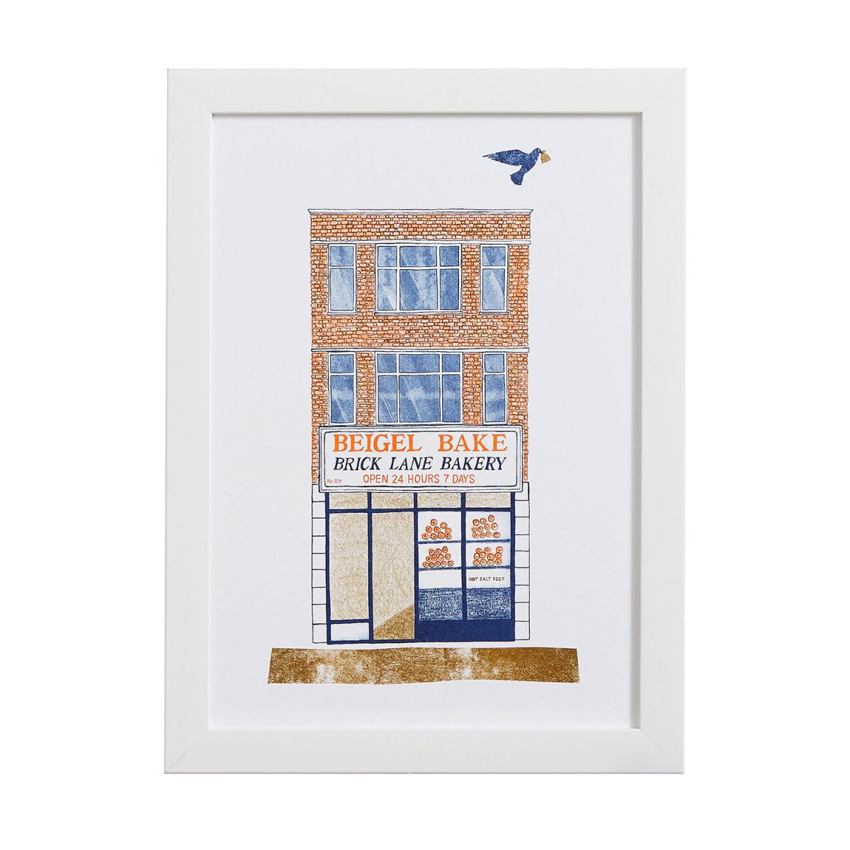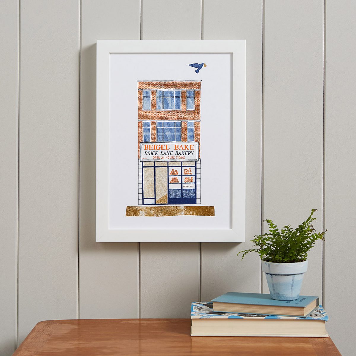 The print is sold unframed and will fit a standard A4 frame. It pairs very well with our Pie House riso print.