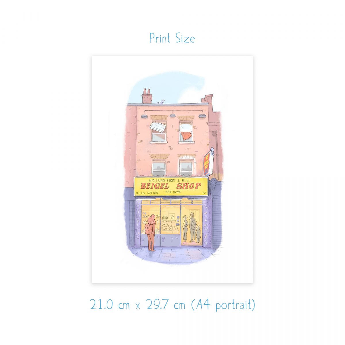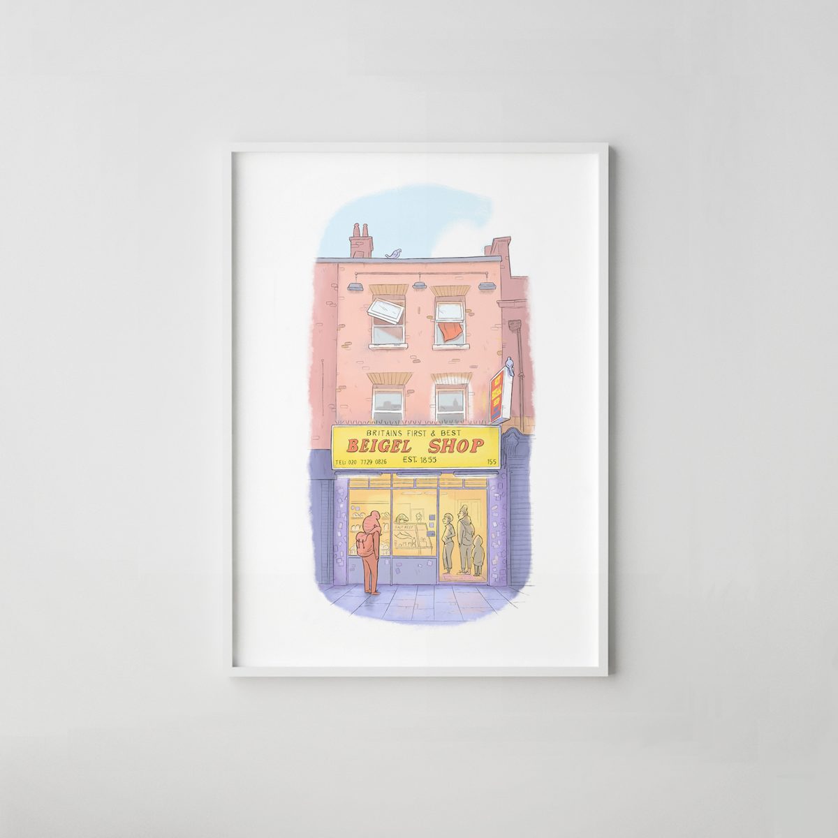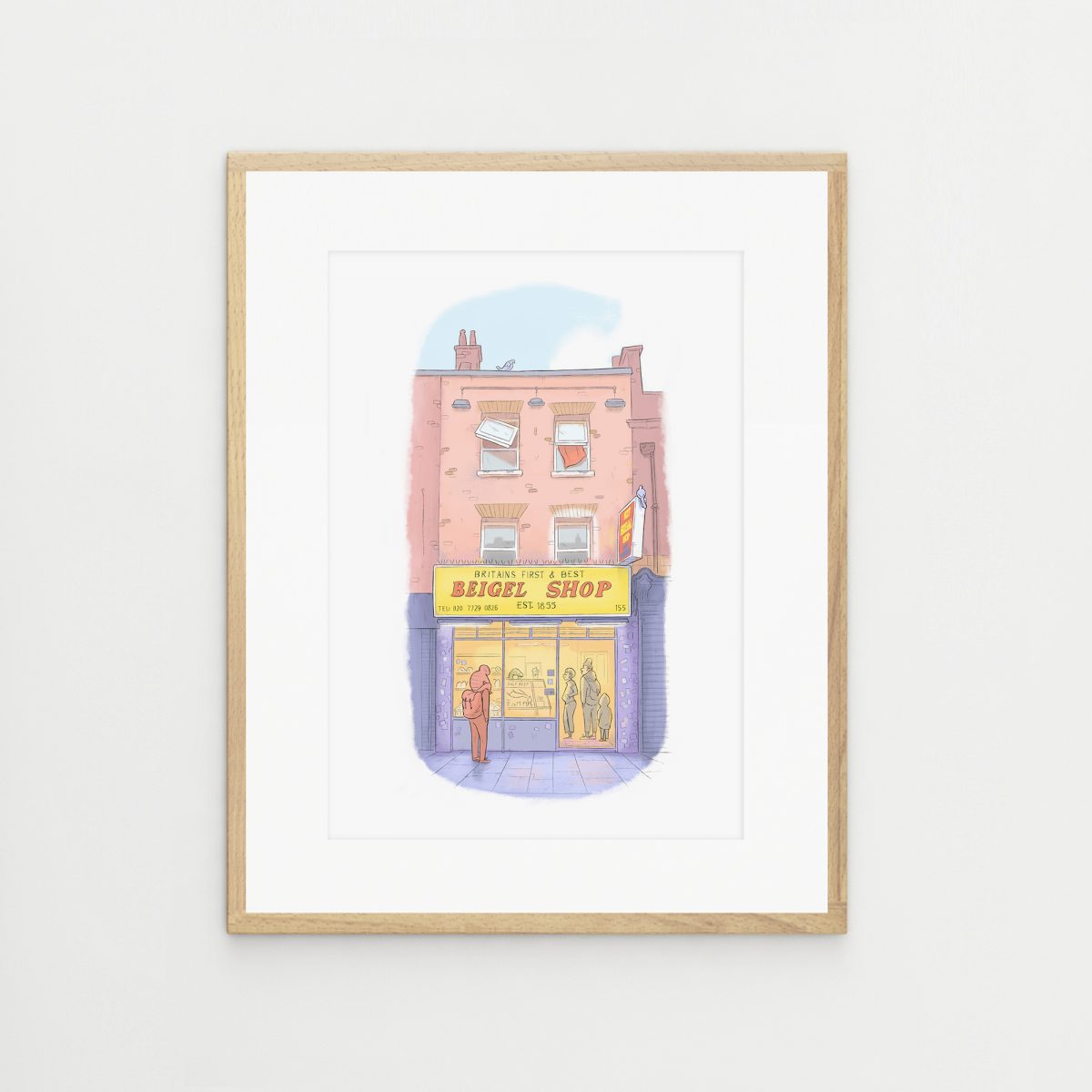 A signed print of the famous Beigel Shop on Brick Lane in Shoreditch London, known locally as “the yellow one”. Established in 1855, this shop has been selling beigels for over 150 years.