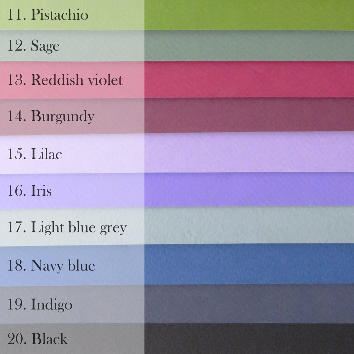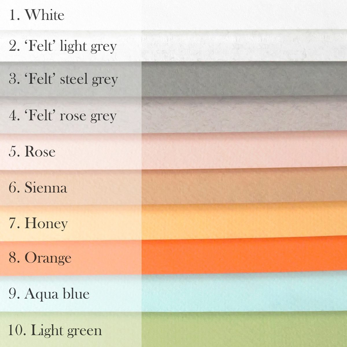 Ciara uses Fabriano paper, as it has high archival performance. Please refer to the colour charts pictured when selecting your lettering colour (20 available).