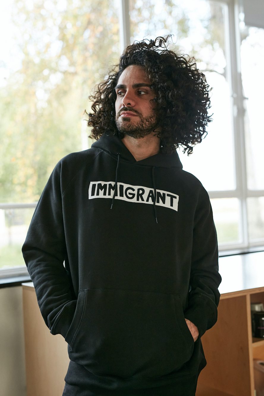 Make a statement with the Black Immigrant Hoodie, ethically and sustainably produced in London. This unisex hoodie is screen printed by Fifth Column on certified organic Continental raglan hoodies, combining comfort, style, and a powerful message.