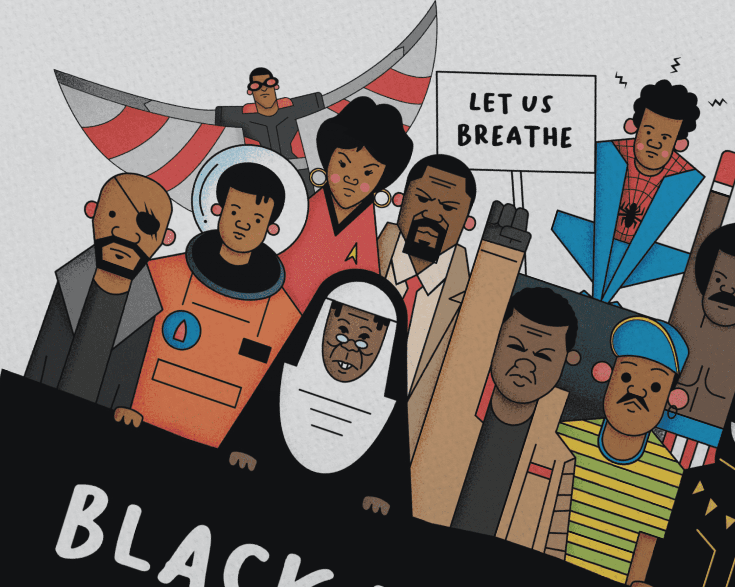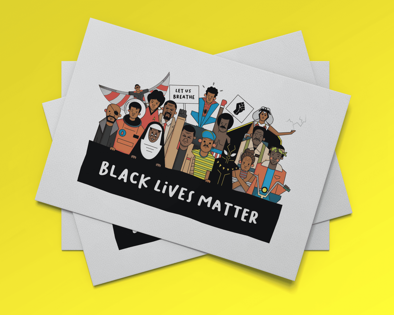 I wanted to celebrate the impact the black community has had on Pop Culture, whilst raising awareness that more needs to be done to root out systemic racism in all walks of life and industries. This print is just a selection of black characters that inspire me.