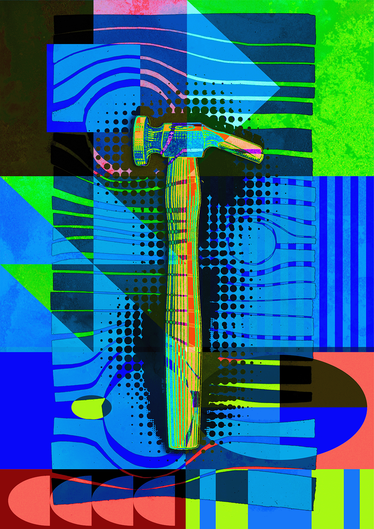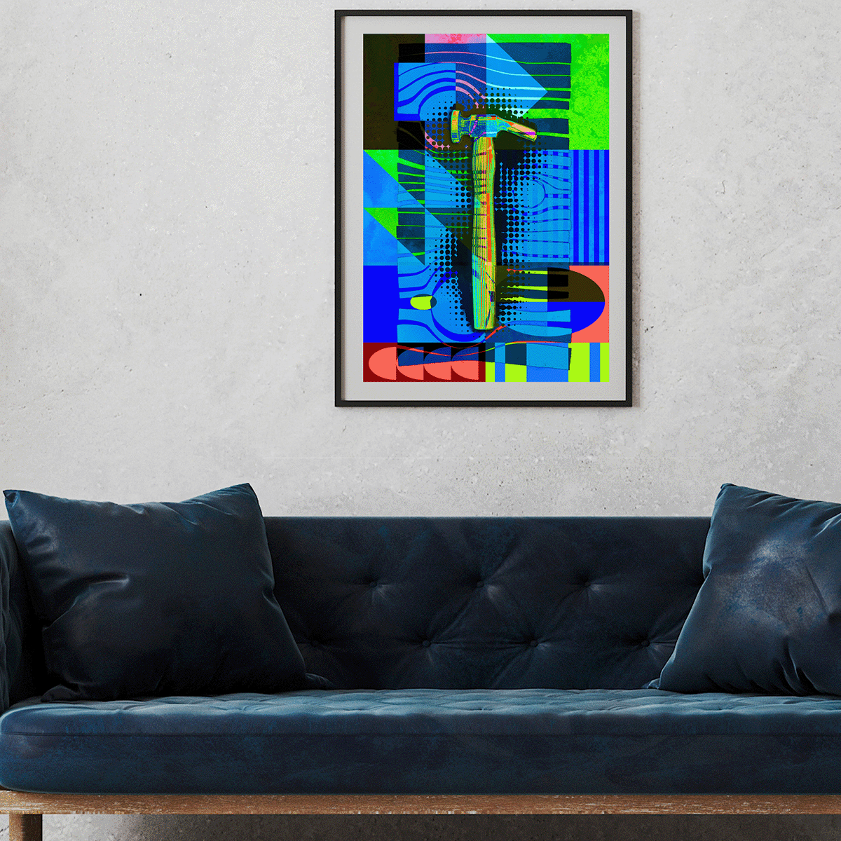 Blue Hammer Giclée print, part of my Essential Tools series, is a heartfelt acknowledgment to the influential artist Jim Dine. His dressing gown paintings captivated my youth, fuelling my obsession with creating art through fashion. Immersed in the vibrant Pop Art scene of 60s America, I developed an appreciation for everyday objects and their stories, much like Jasper Johns’ beer cans and Claus Oldenberg’s toothpaste tube. Each object in my series is a visual diary, aimed at bringing a smile to both myself and hopefully others.