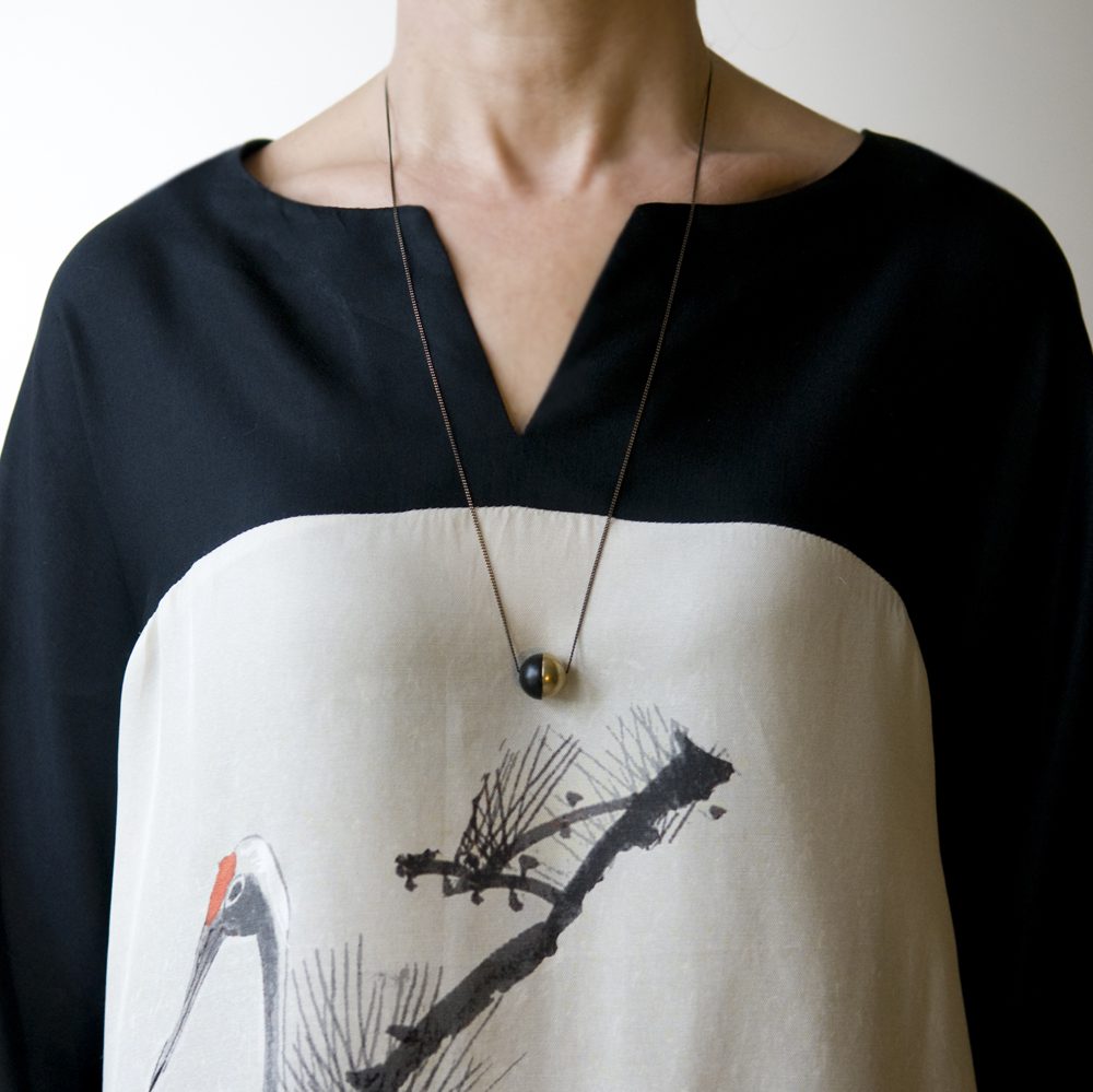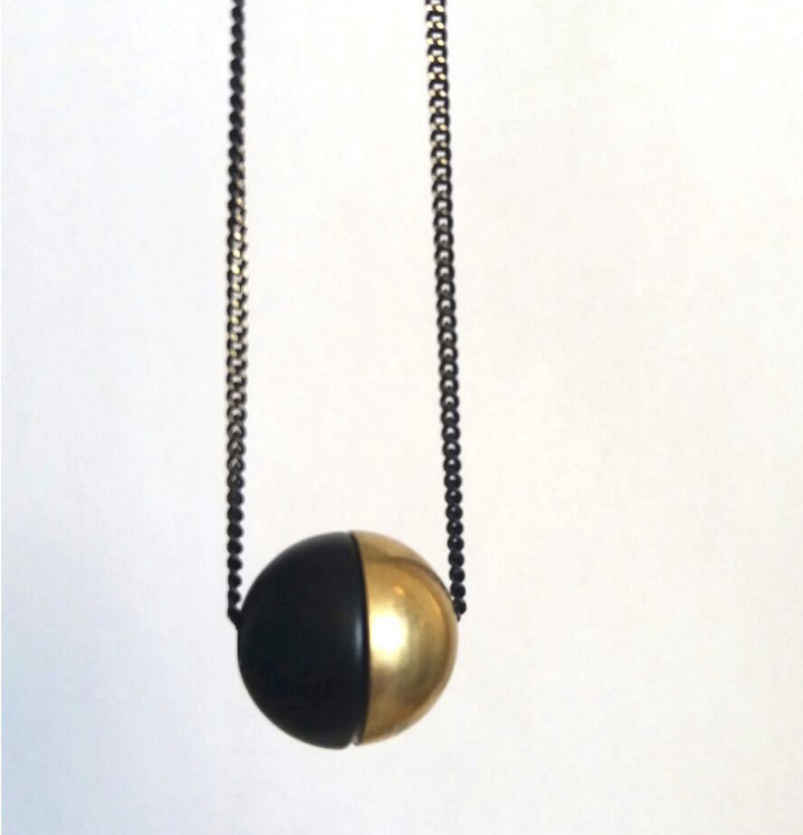 Stylish brass necklace. two solid halves circles making a perfect ball, one black and the other brass on a black/brass chain.
