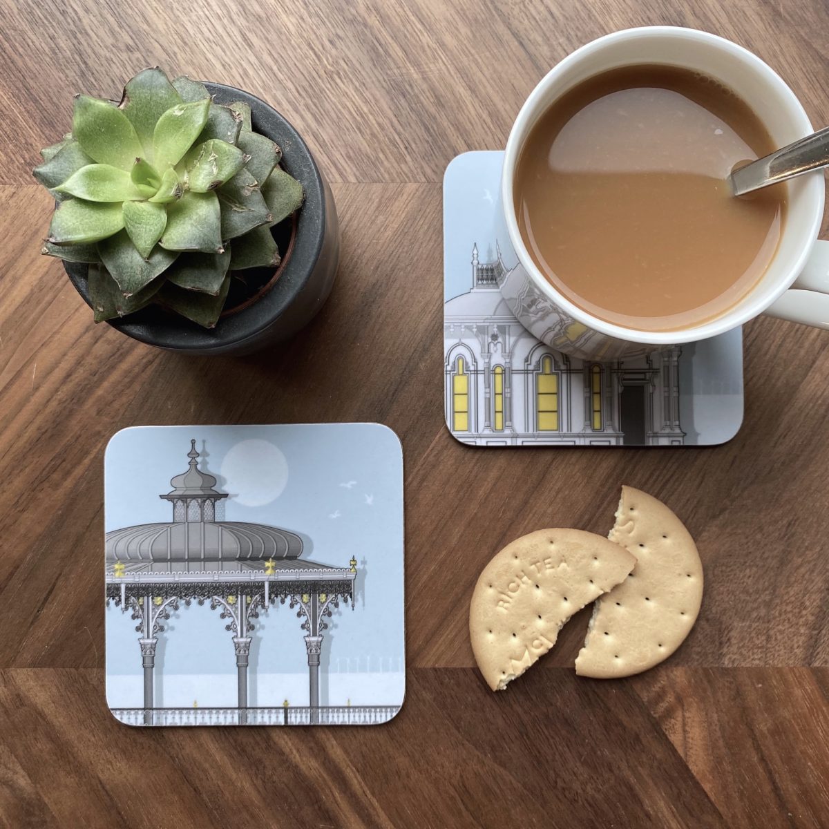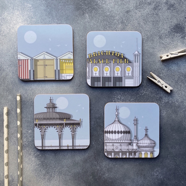 The Brighton Sun Coasters, Set of four – featuring some of Brighton’s most recognisable landmarks: Royal Pavilion, Bandstand, Palace Pier and Beach Huts.