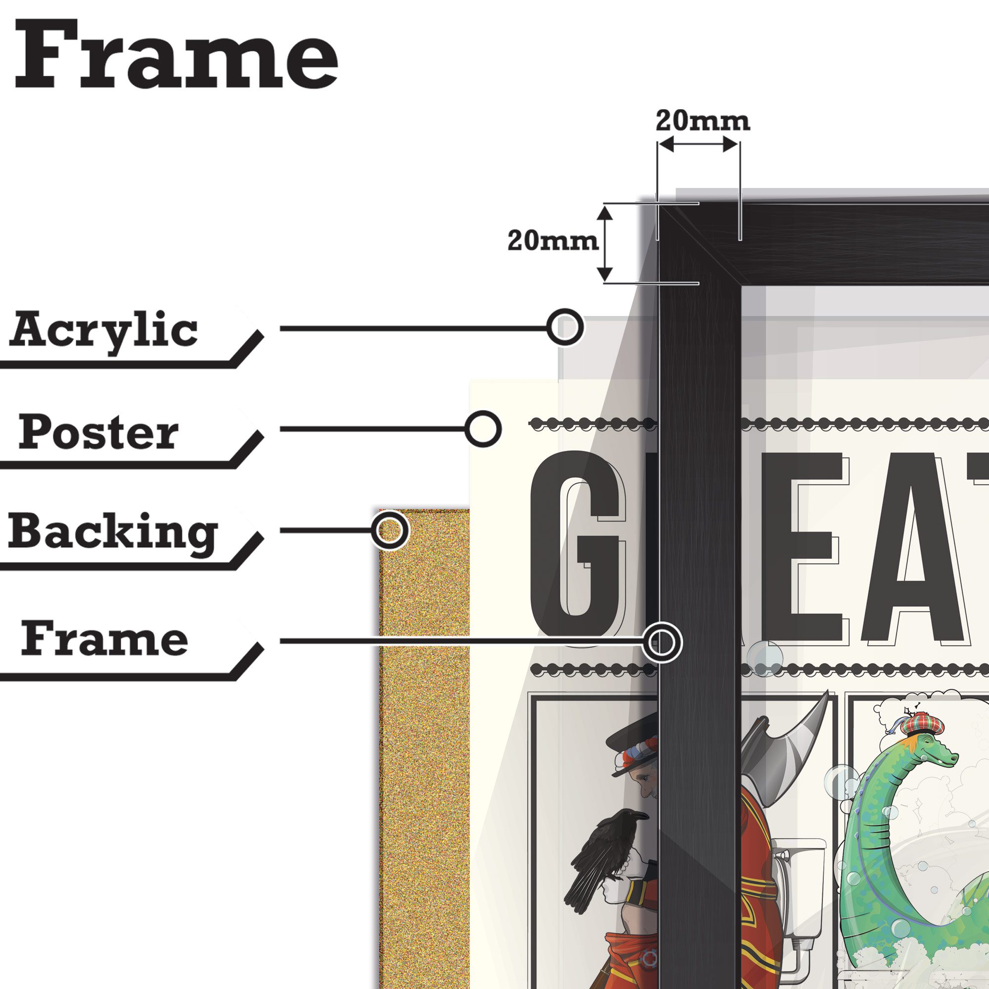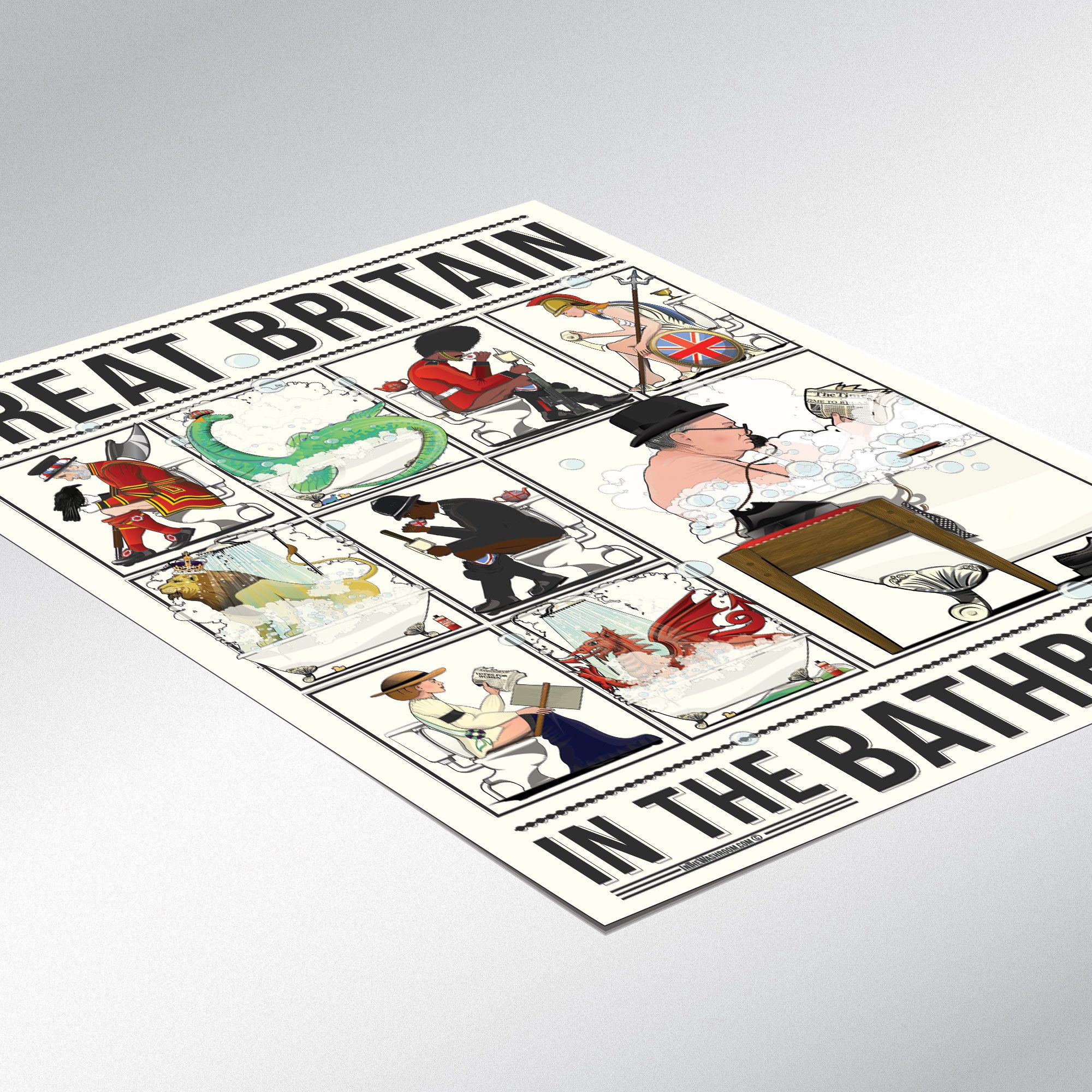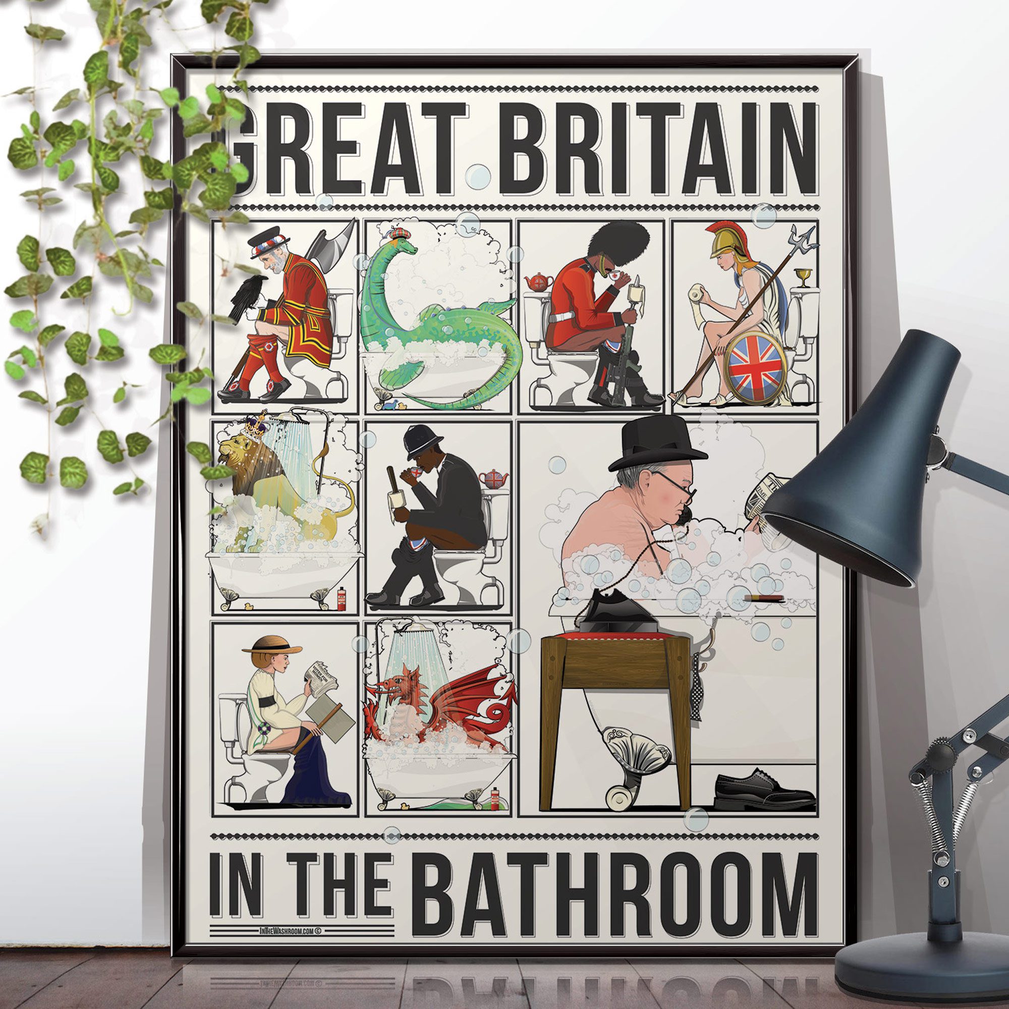 Britain in the bathroom, funny bathroom poster for all those who love all things British. Included within this poster are all your favourite British icons, including Winston Churchill, Nessie, the monster, the welsh dragon and many more!