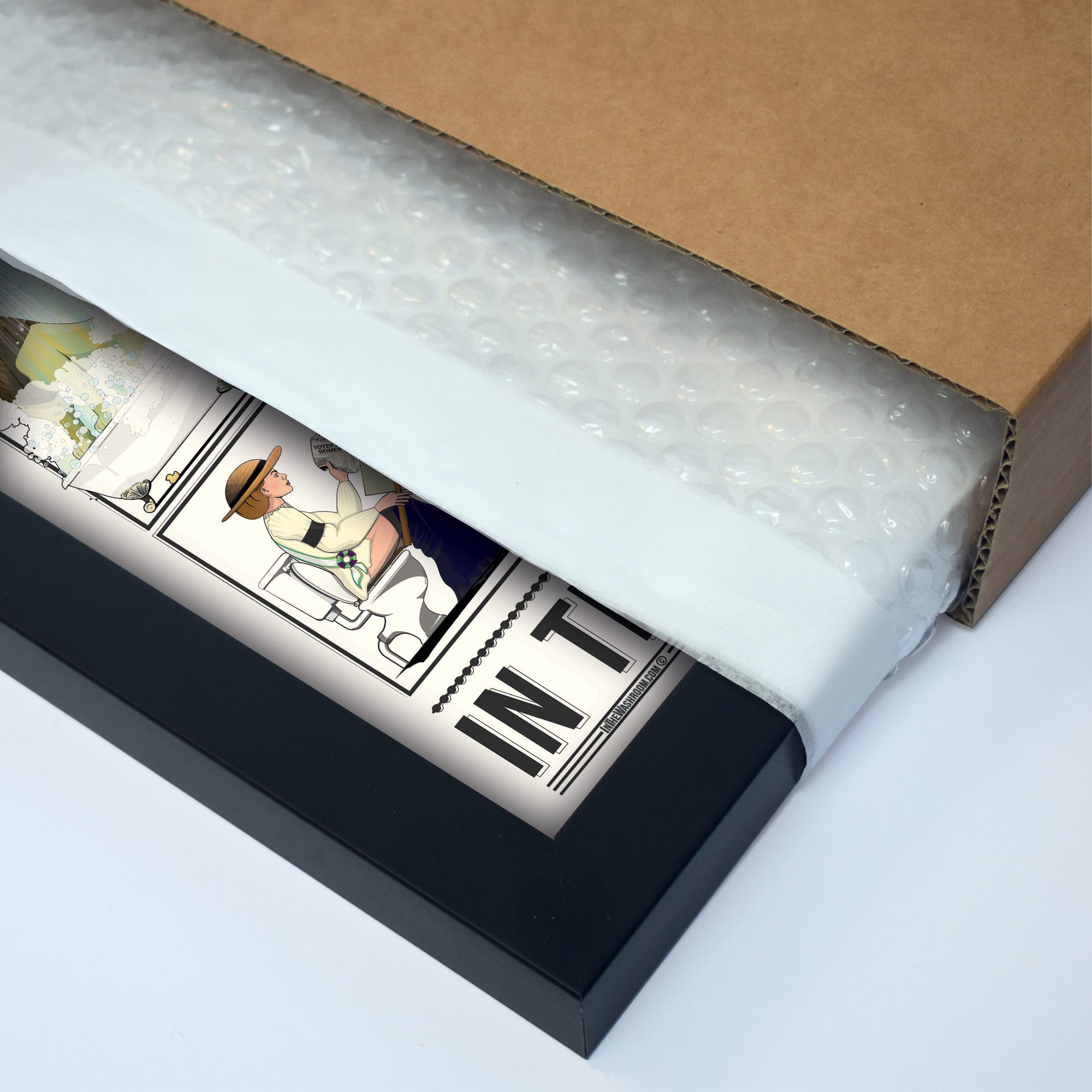 Thick 180 gsm paper, matte finish. Packed carefully in a postal tube or packed with if framed, packed in protective packaging to insure frame isn’t damaged.