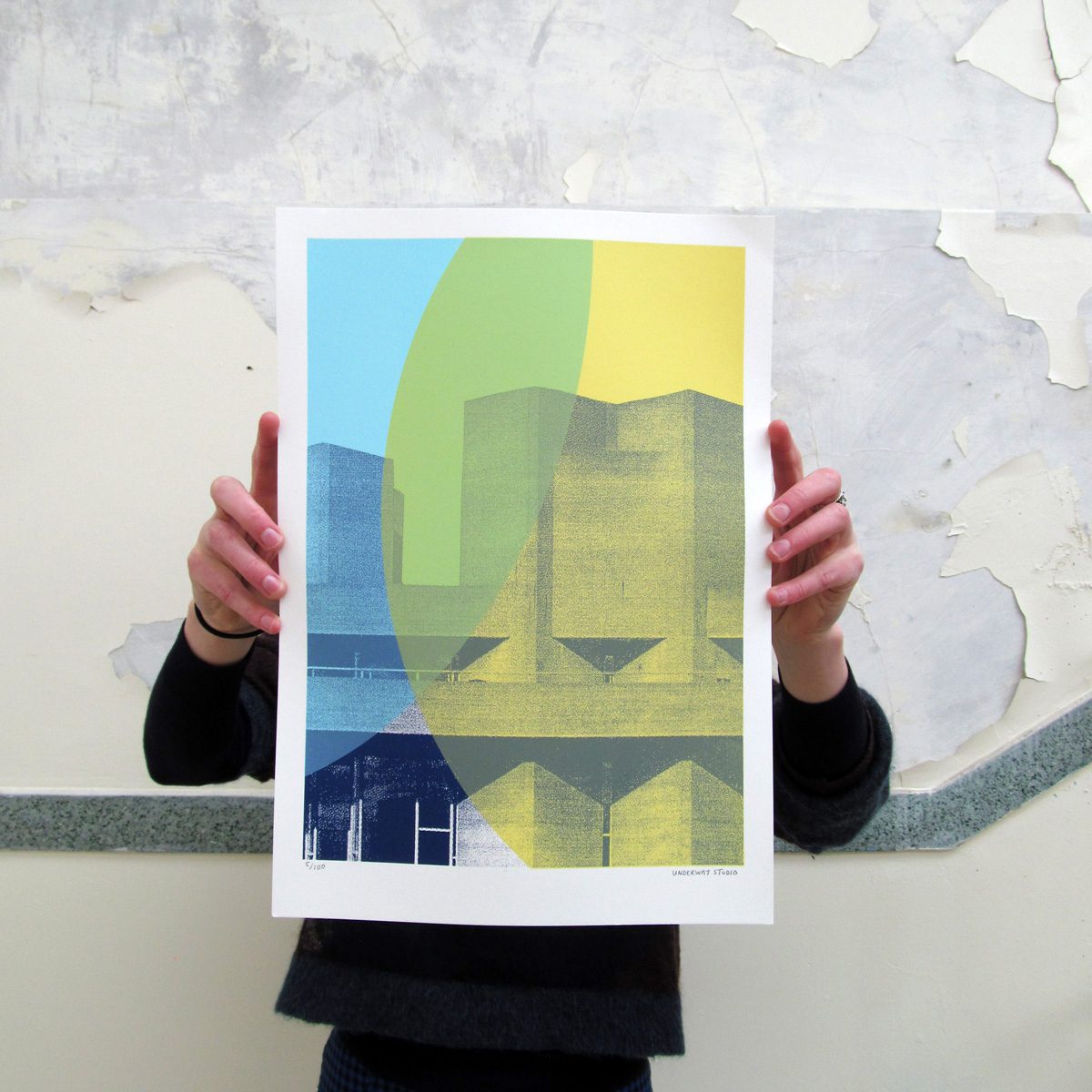 ‘Brutal Forms II’ is a limited edition screen print featuring shapes and photographs of the brutalist National Theatre on London’s Southbank.