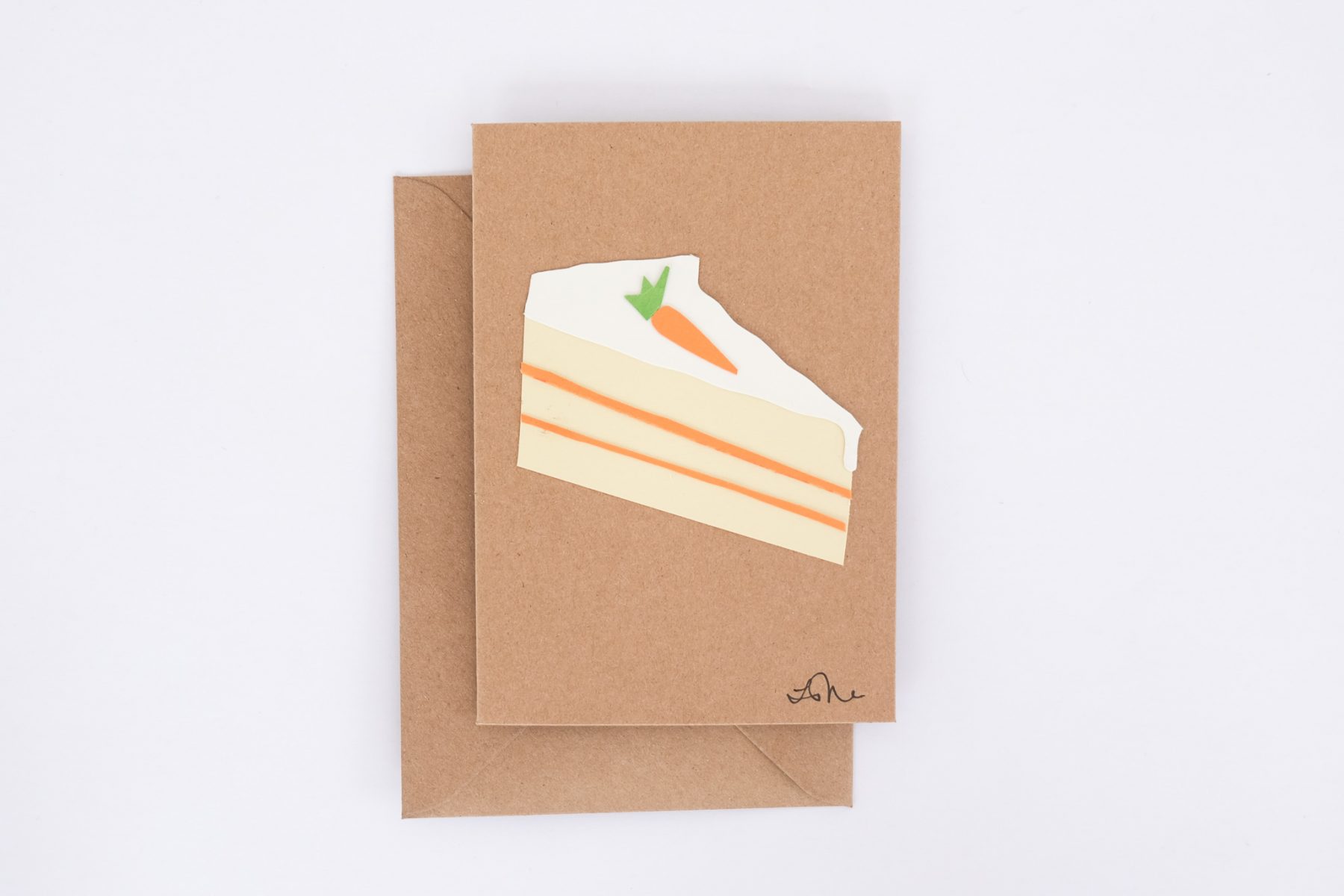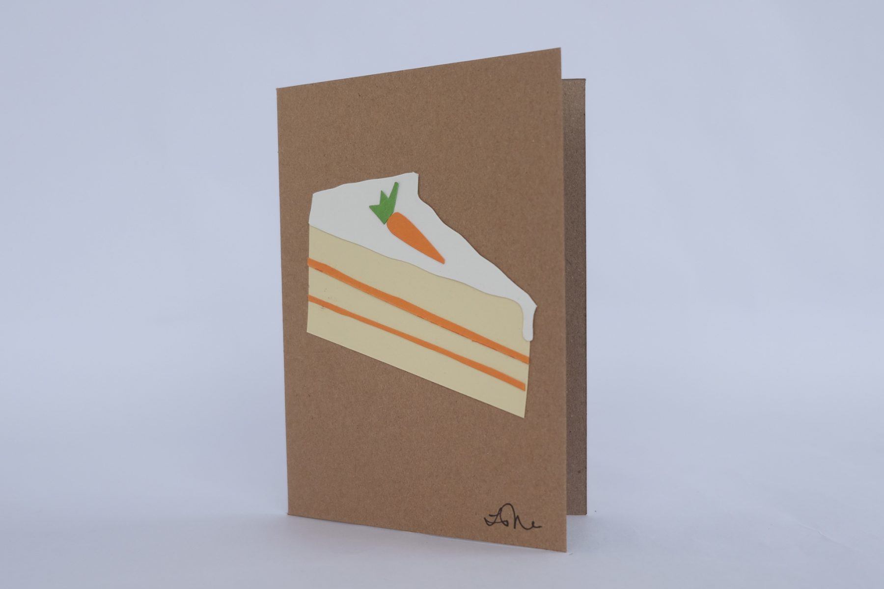 Handmade greetings card. A6 paper size and blank inside for you to write your own personal message. The Carrot Cake card is perfect for birthdays!