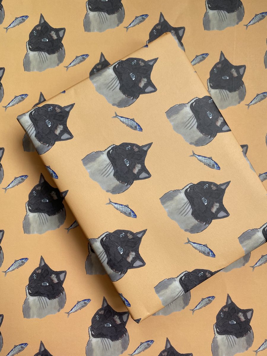 2 sheets of cat and fish thick wrapping paper, with hand drawn print of my cat, Desmond.