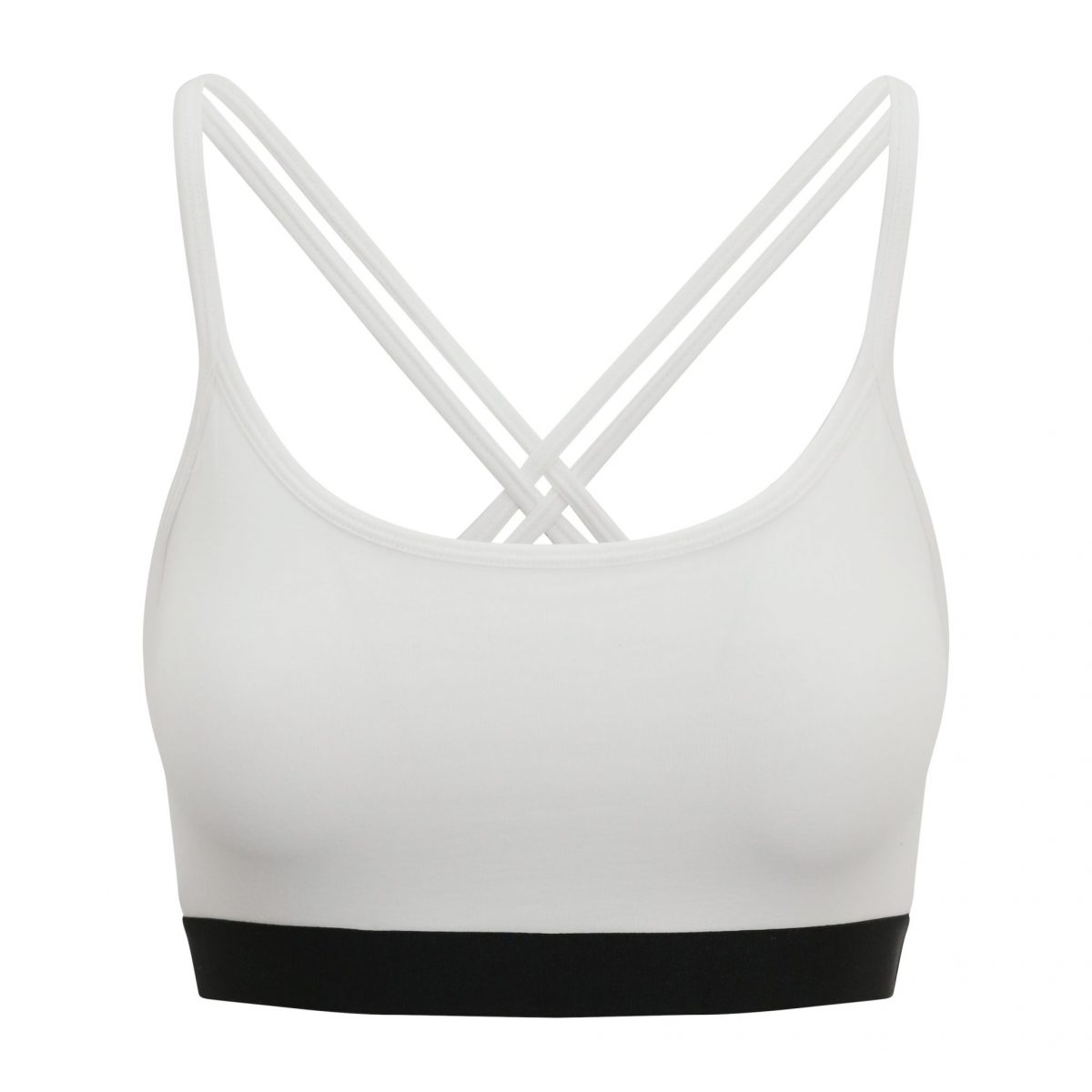 This organic cotton yoga bra delivers on comfort with a super soft finish. Featuring racerback cross over detail, this white and black bra will match easily with other items in your yoga wardrobe. This bra provides ideal support for stretching based and low cardio workouts.