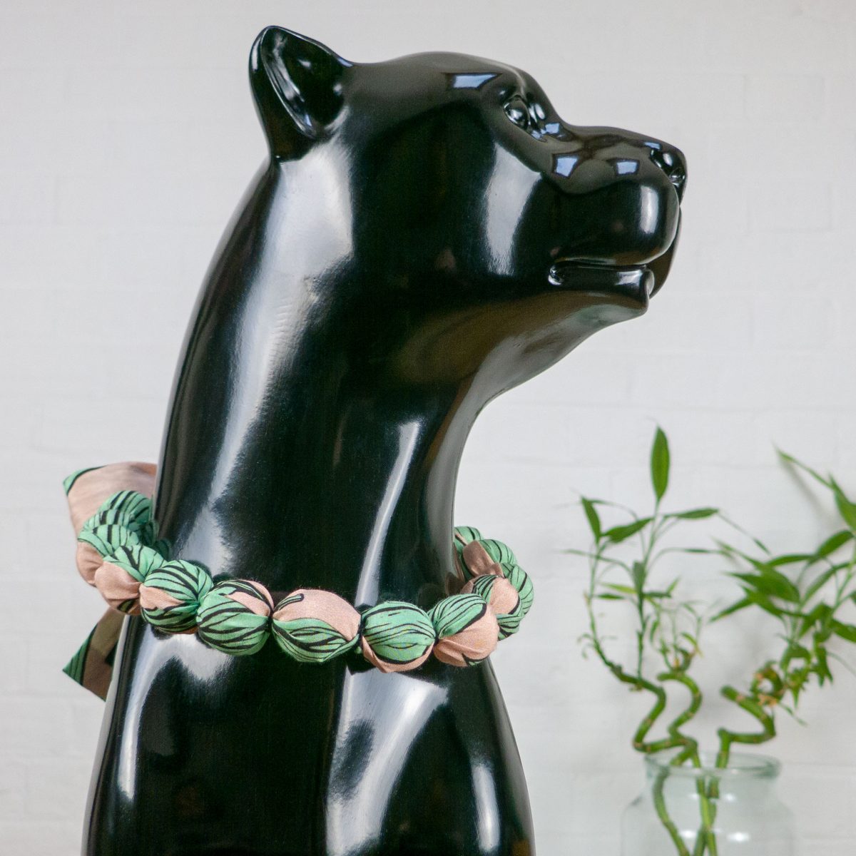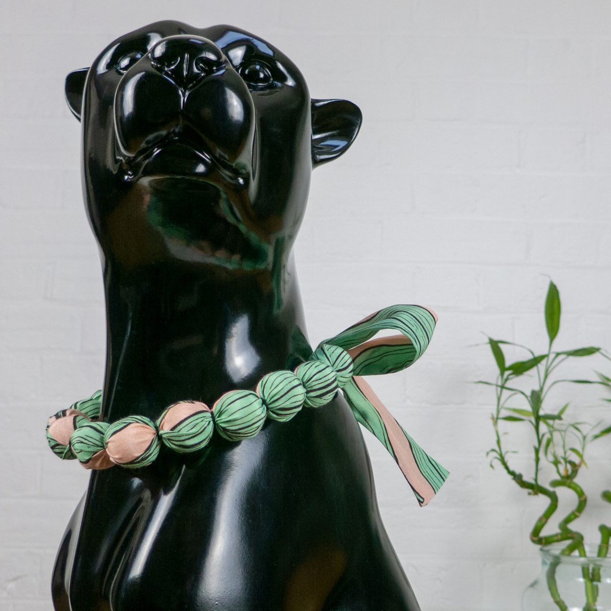 Each necklace is made from recycled swatches of silk-cotton fabric and is 100% handmade by me, the designer. Each piece takes around an hour and a half to create, from cutting the fabric, stitching it to contain the beads, and individually hand sewing each bead in with cotton embroidery thread.