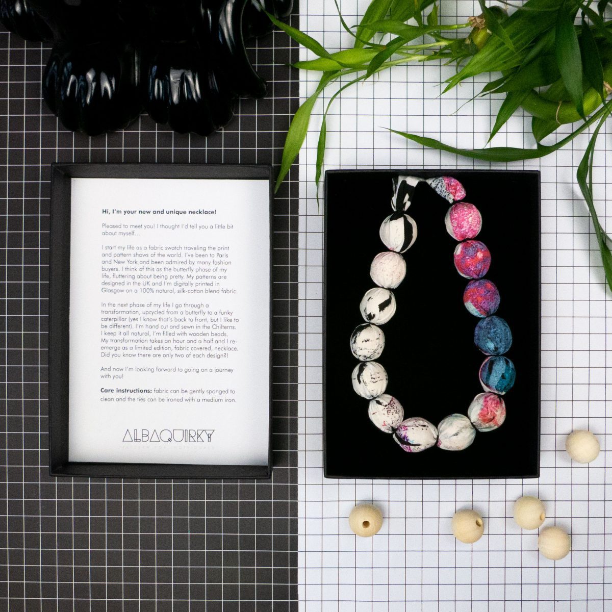 Made from: Made in Britain with silk-cotton blend, digitally printed fabric, hand stitched around wooden beads. The ties can be ironed with a medium iron.