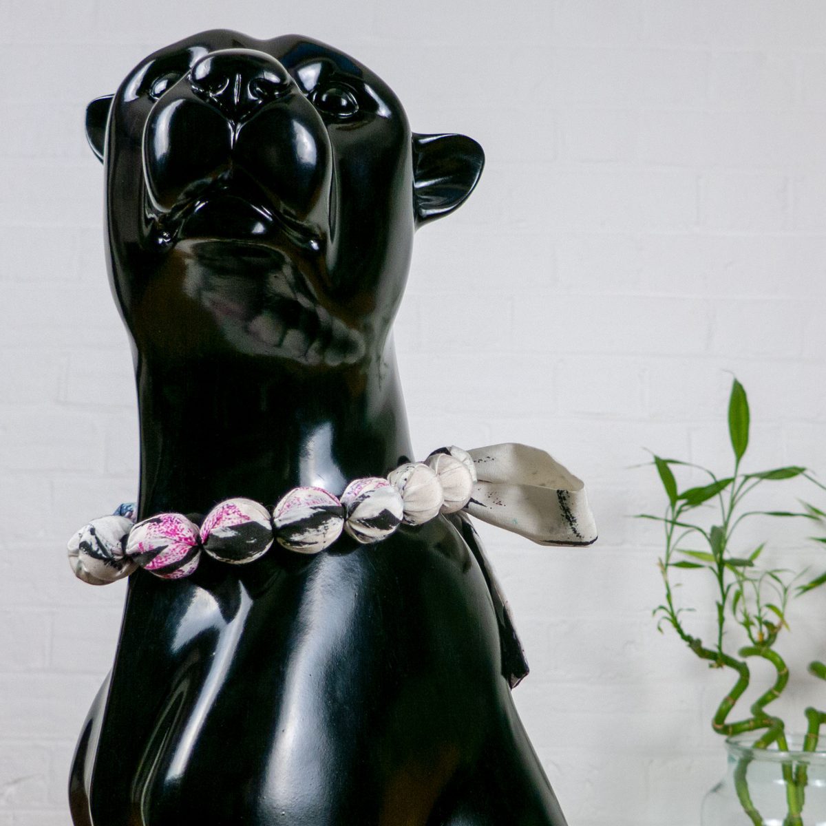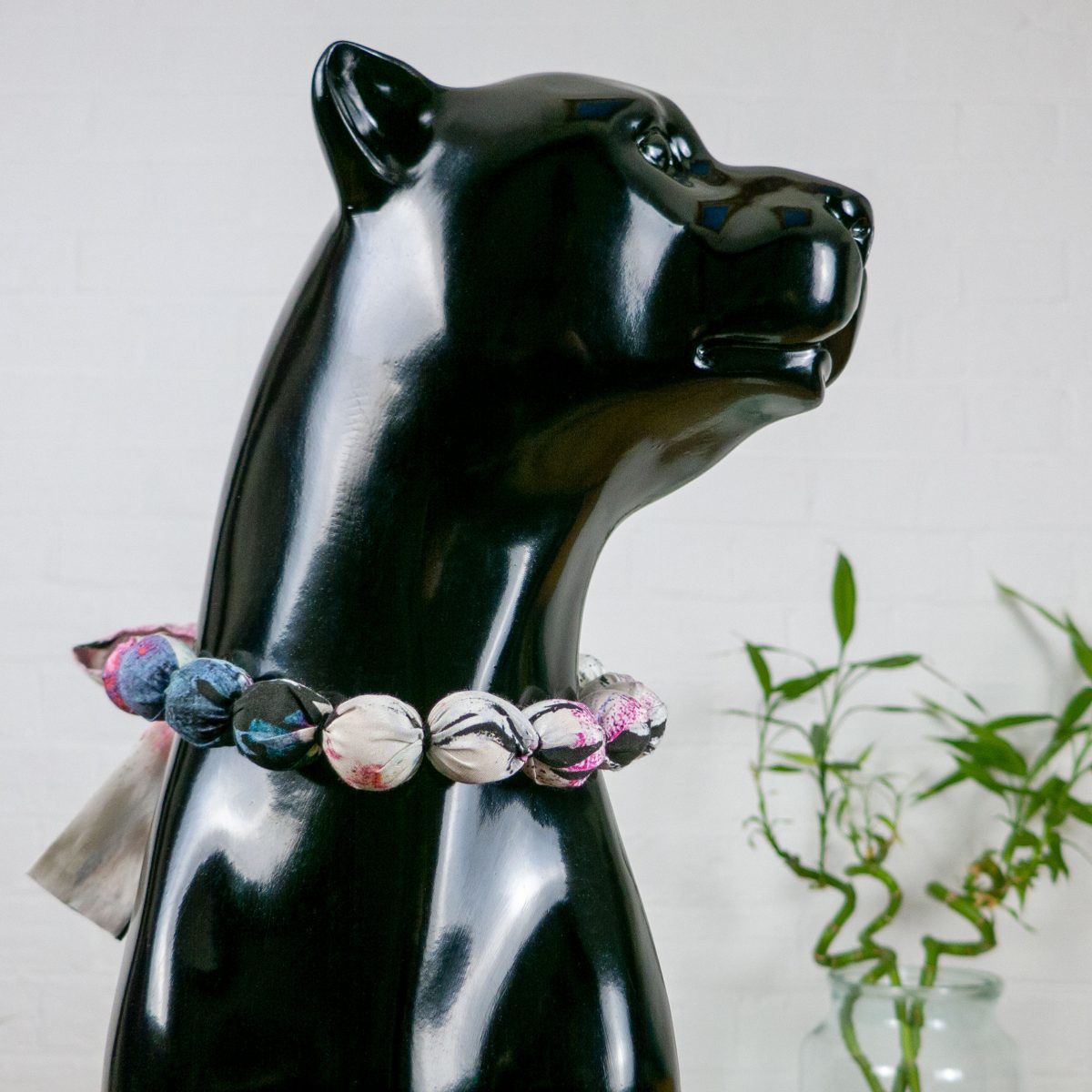Each necklace is made from recycled swatches of silk-cotton fabric and is 100% handmade by me, the designer. Each piece takes around an hour and a half to create, from cutting the fabric, stitching it to contain the beads, and individually hand sewing each bead in with cotton embroidery thread.