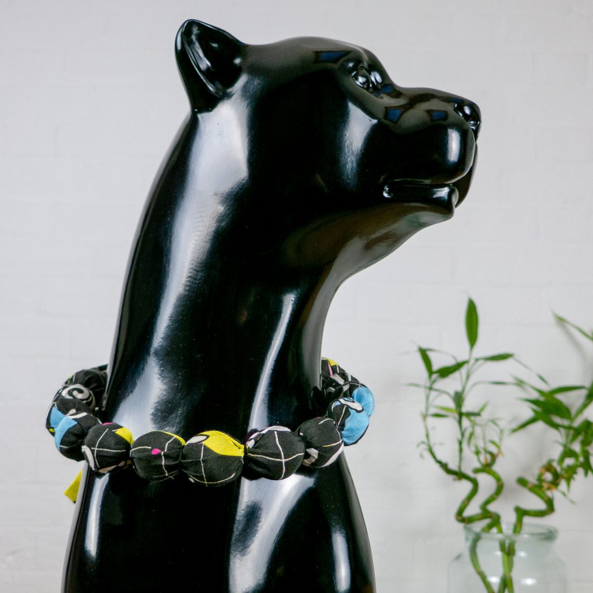 Each necklace is made from recycled swatches of silk-cotton fabric and is 100% handmade by me, the designer. Each piece takes around an hour and a half to create, from cutting the fabric, stitching it to contain the beads, and individually hand sewing each bead in with cotton embroidery thread.