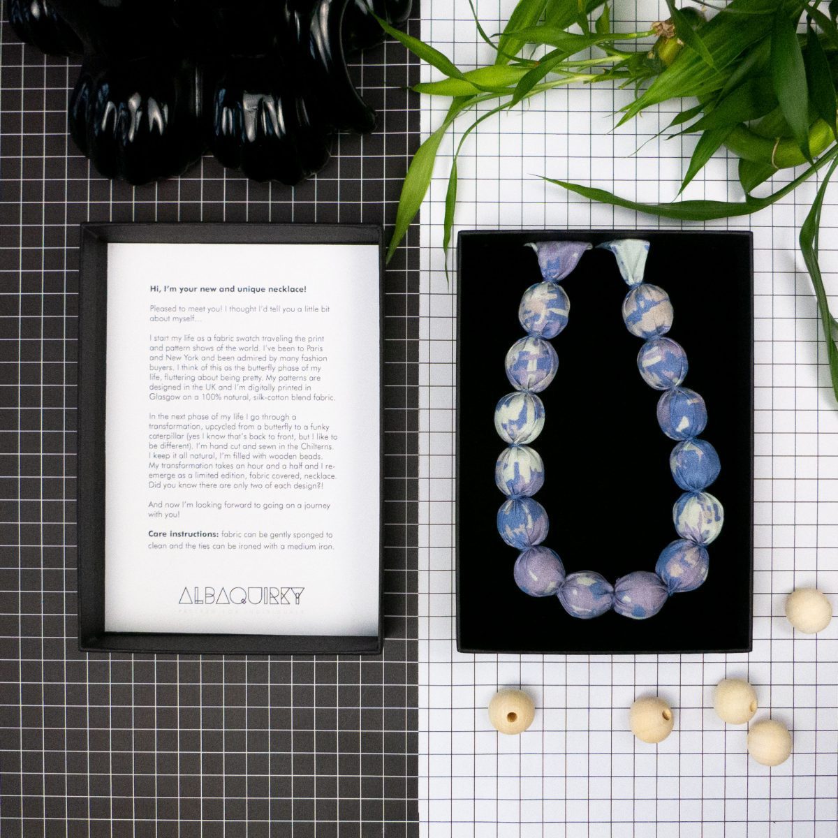 Made from: Made in Britain with silk-cotton blend, digitally printed fabric, hand stitched around wooden beads. The ties can be ironed with a medium iron.
