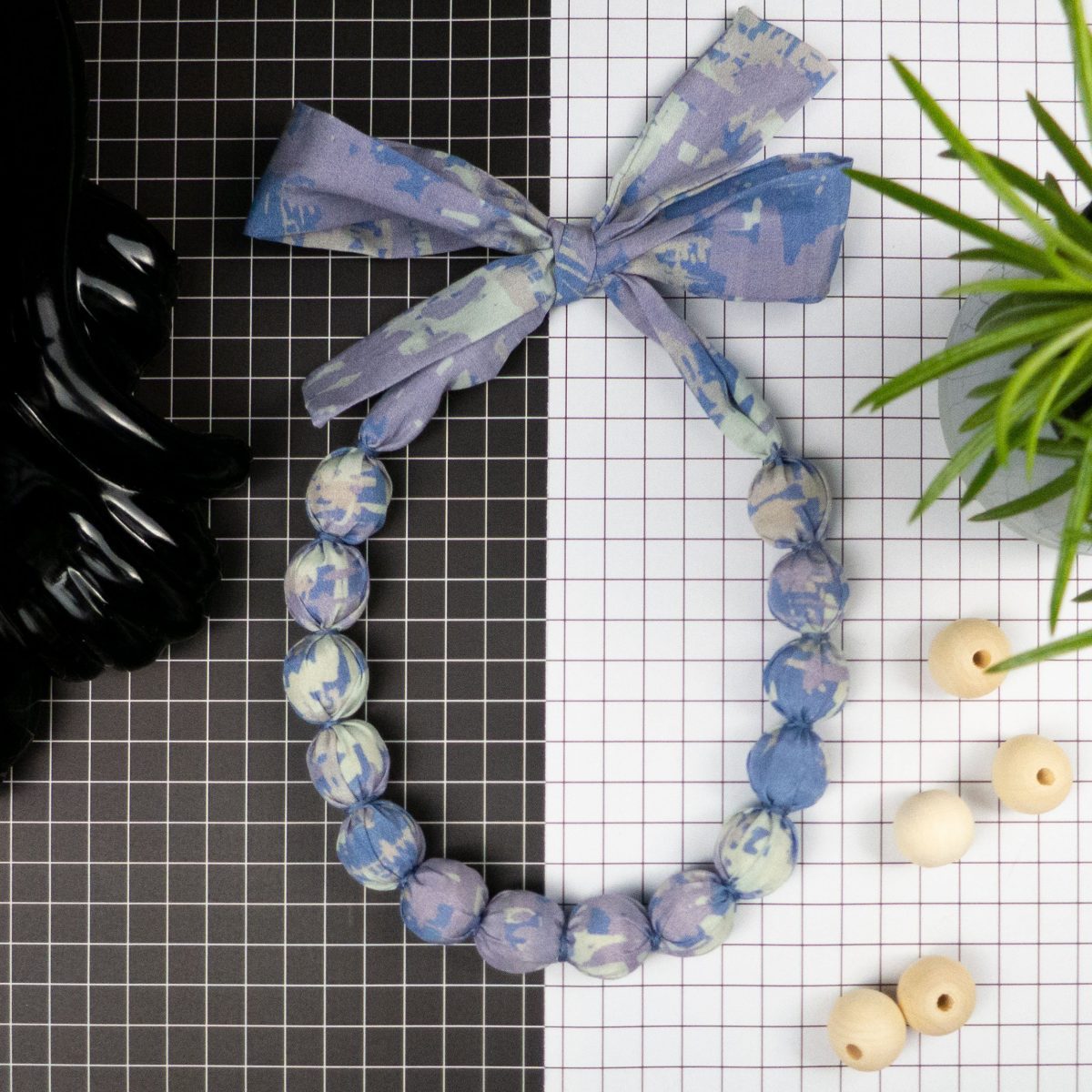 A contemporary, chunky, bead necklace. Handmade from recycled silk-cotton fabric covered wooden beads. A unique and limited edition piece of statement jewellery.