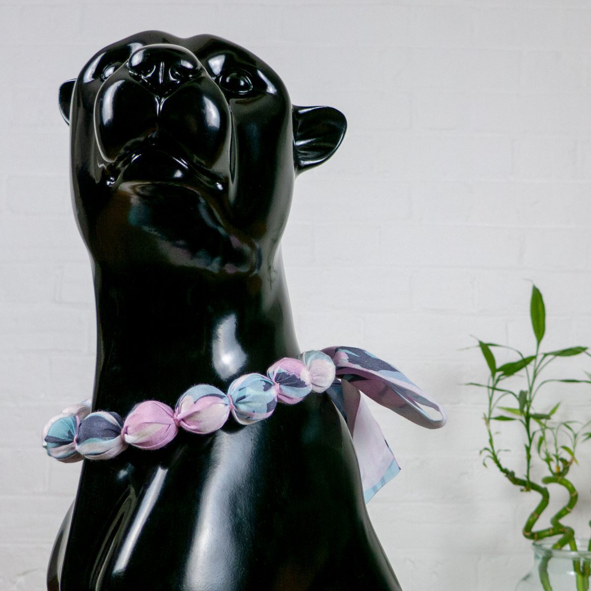Each necklace is made from recycled swatches of silk-cotton fabric and is 100% handmade by me, the designer. Each piece takes around an hour and a half to create, from cutting the fabric, stitching it to contain the beads, and individually hand sewing each bead in with cotton embroidery thread.