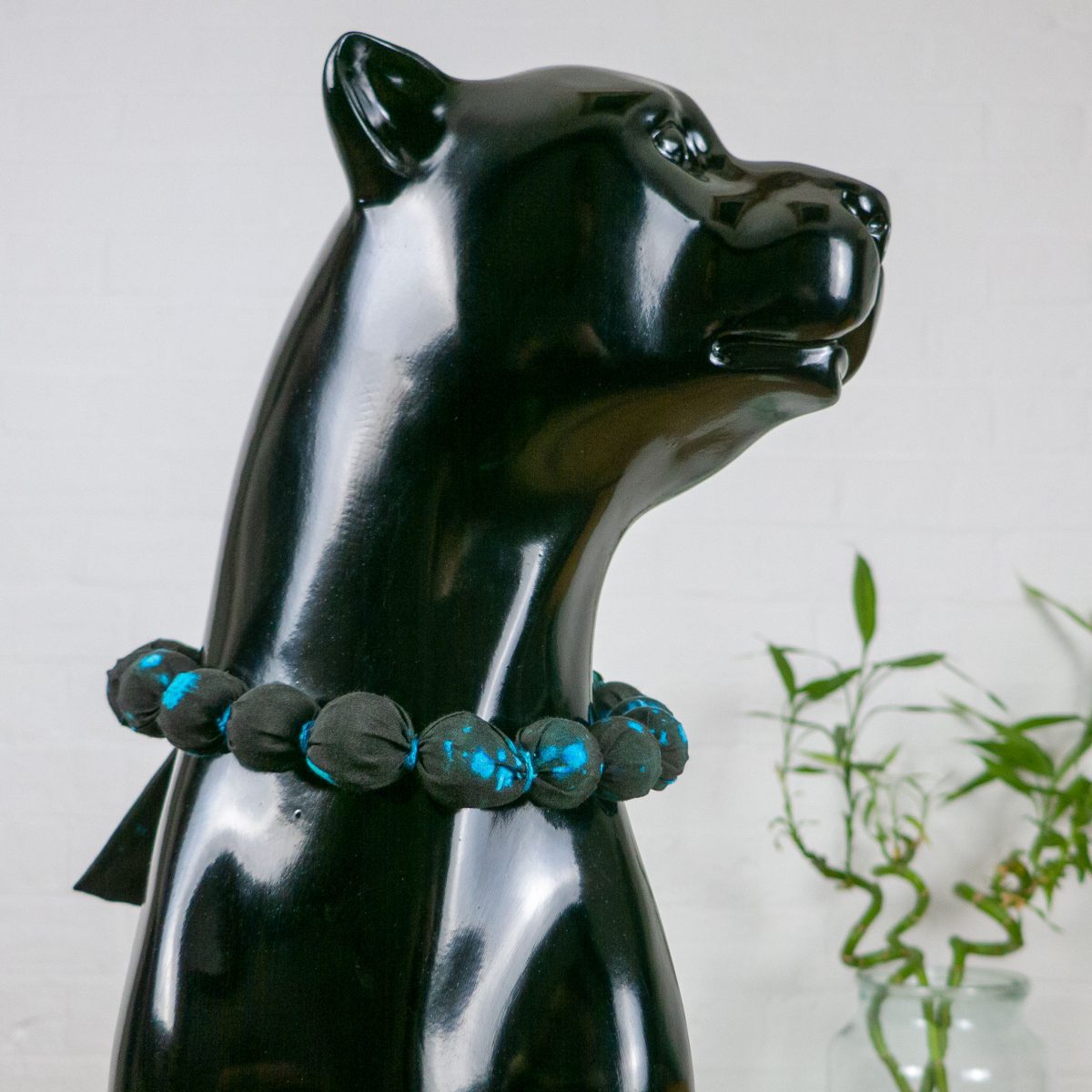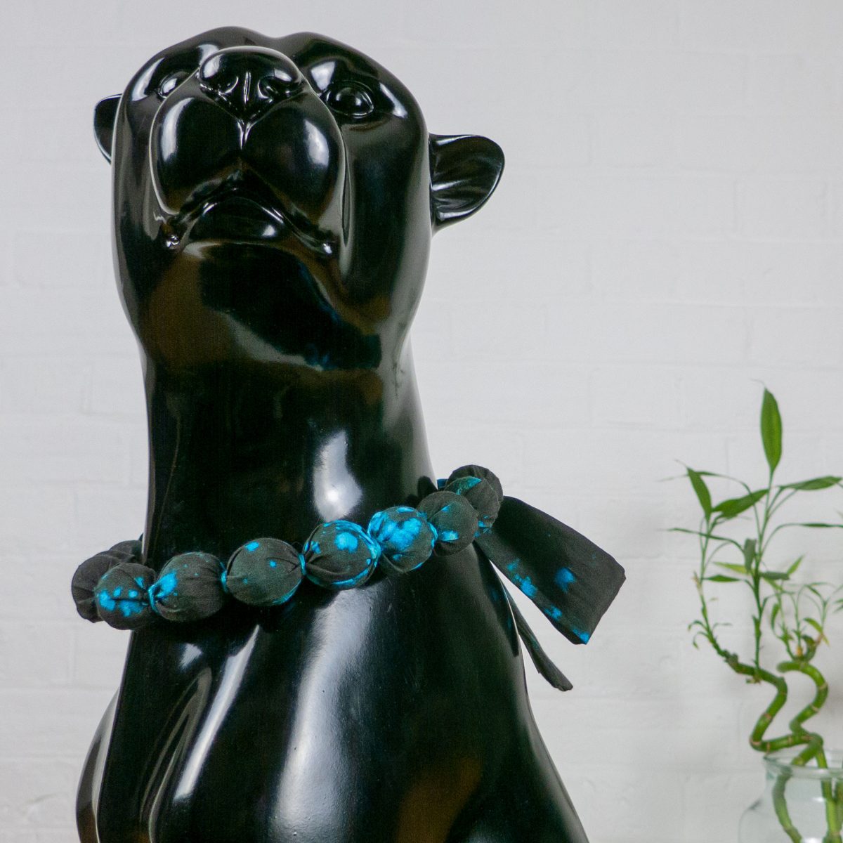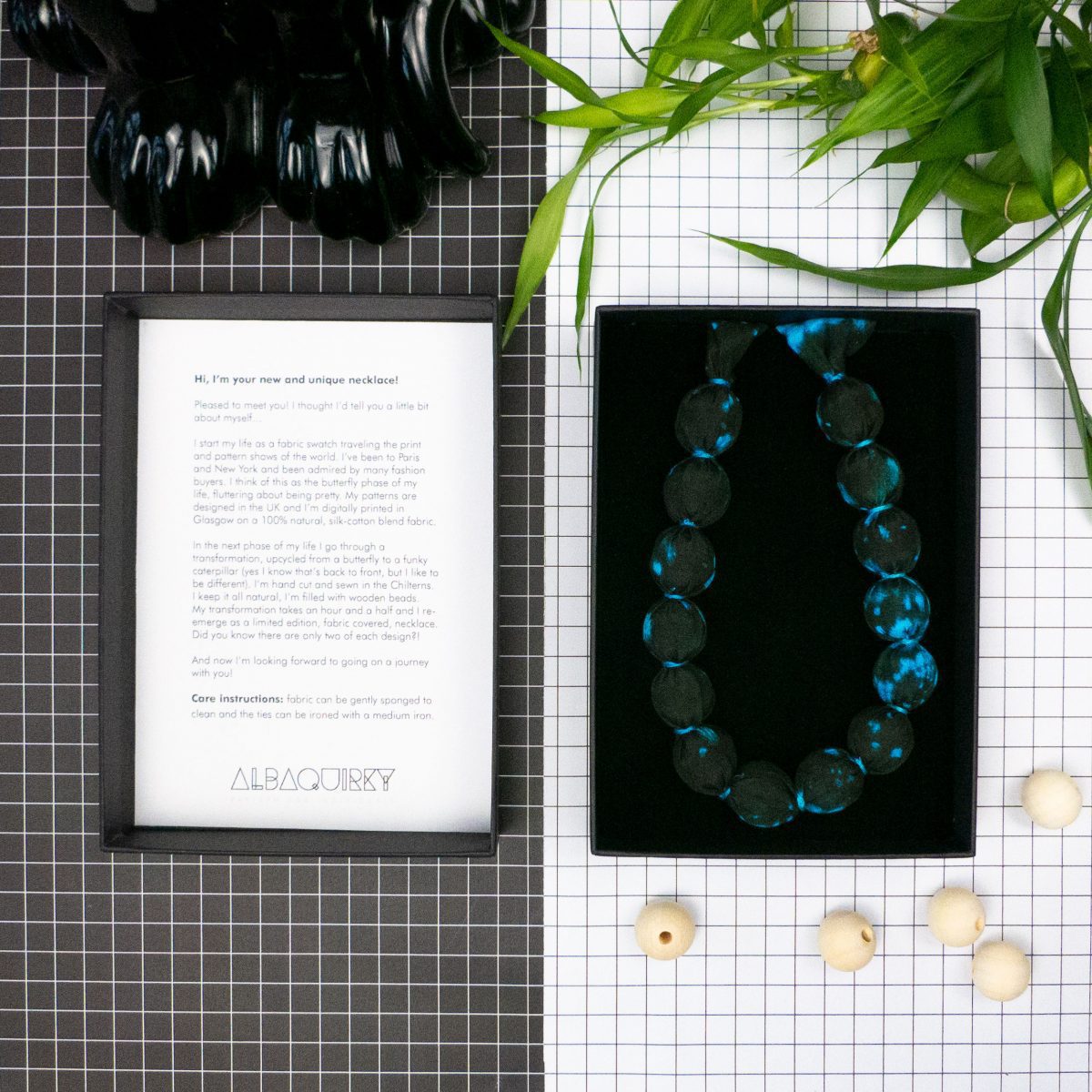 Each necklace is made from recycled swatches of silk-cotton fabric and is 100% handmade by me, the designer. Each piece takes around an hour and a half to create, from cutting the fabric, stitching it to contain the beads, and individually hand sewing each bead in with cotton embroidery thread.