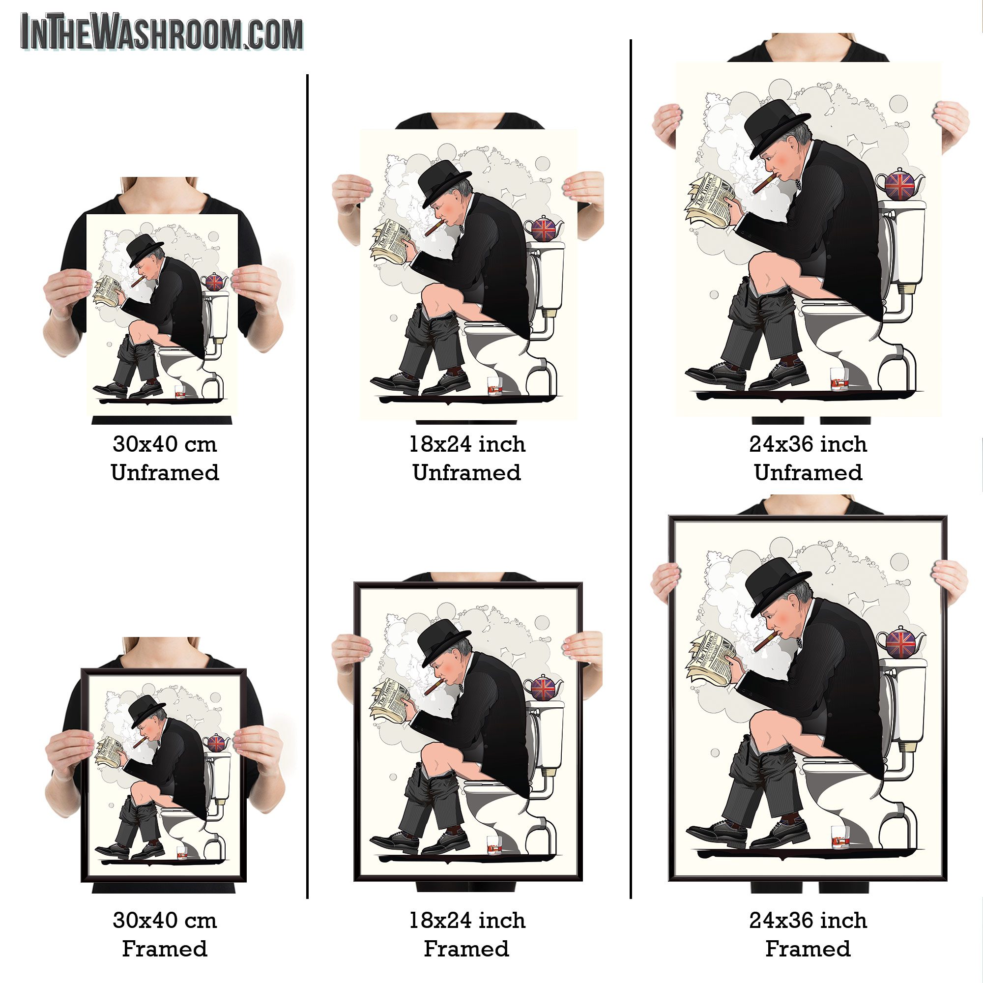Winston Churchill on the toilet, funny artwork for your WC, guest bathroom or en suite. A little bit of Britain for your bath wall. We Also have Churchill in the bath amongst many other bathroom themed posters!