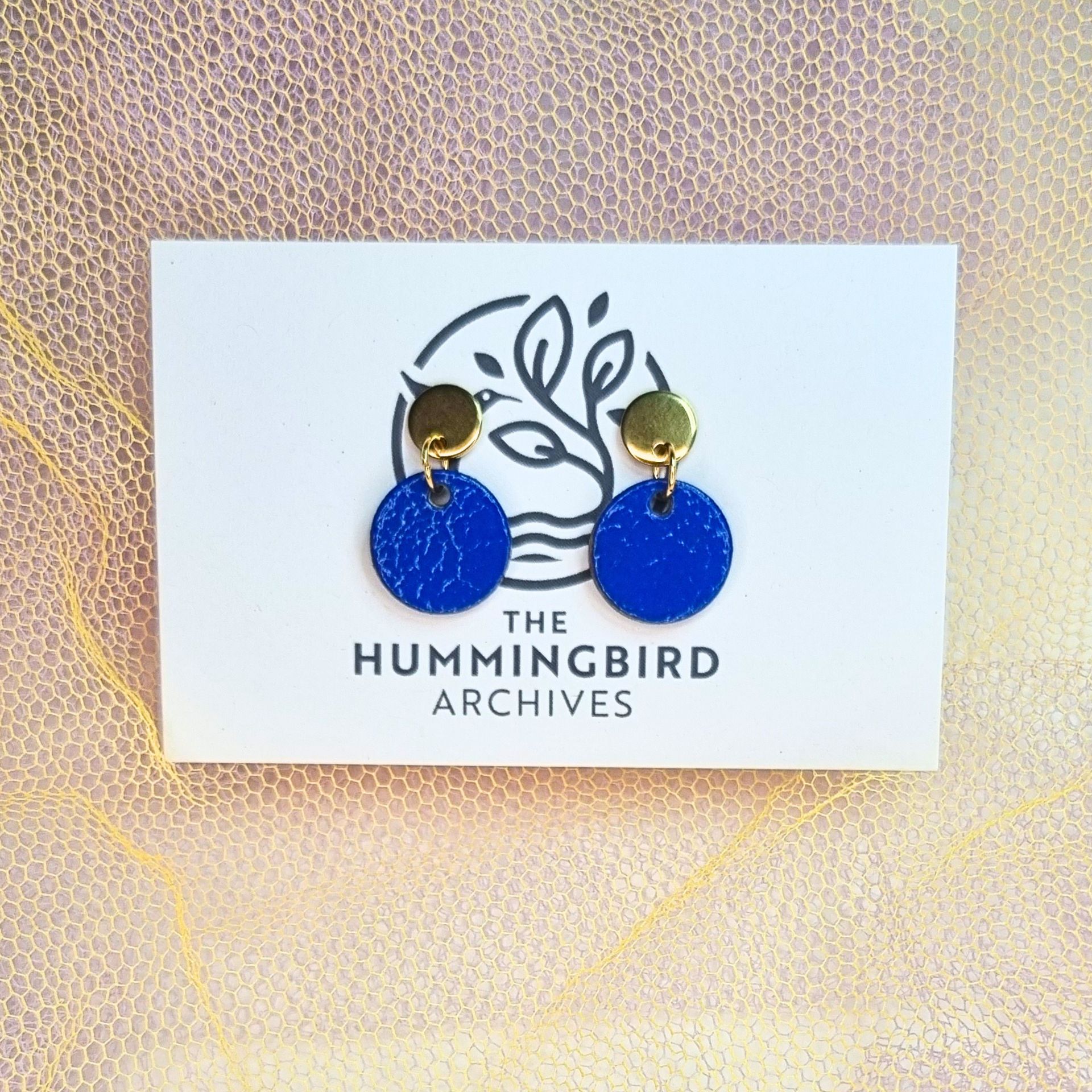 Add a bold pop of colour to your look with these Cobalt Blue Mini Circle Earrings – lightweight, eye-catching, and full of personality. Handmade from high-quality textured leather painted in a rich cobalt blue, these earrings are designed to brighten up any outfit with their vibrant tone. Finished with sleek stainless steel studs in your choice of gold or silver, they offer the perfect mix of everyday wearability and modern style.