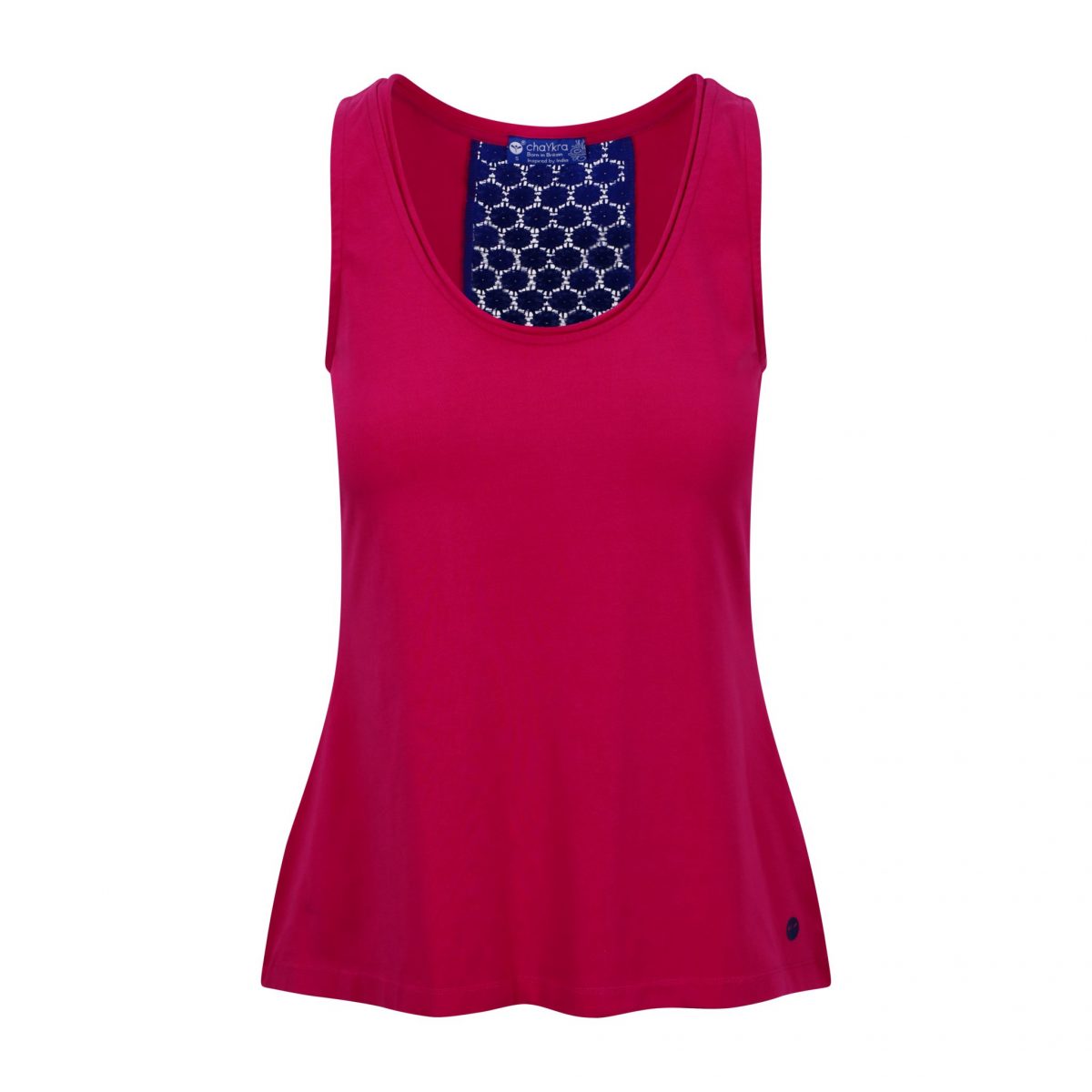 Enhance your yoga wardrobe with a head-turning style in this organic cotton tank with flower-designed lace back detail. The bright magenta base colour is enhanced with the contrasting navy lace panel. The vibrant colour, along with contrast detail, makes it perfect for a stylish class to social look. The organic cotton blend gives a premium quality softness, comfortable stretch and breathability.