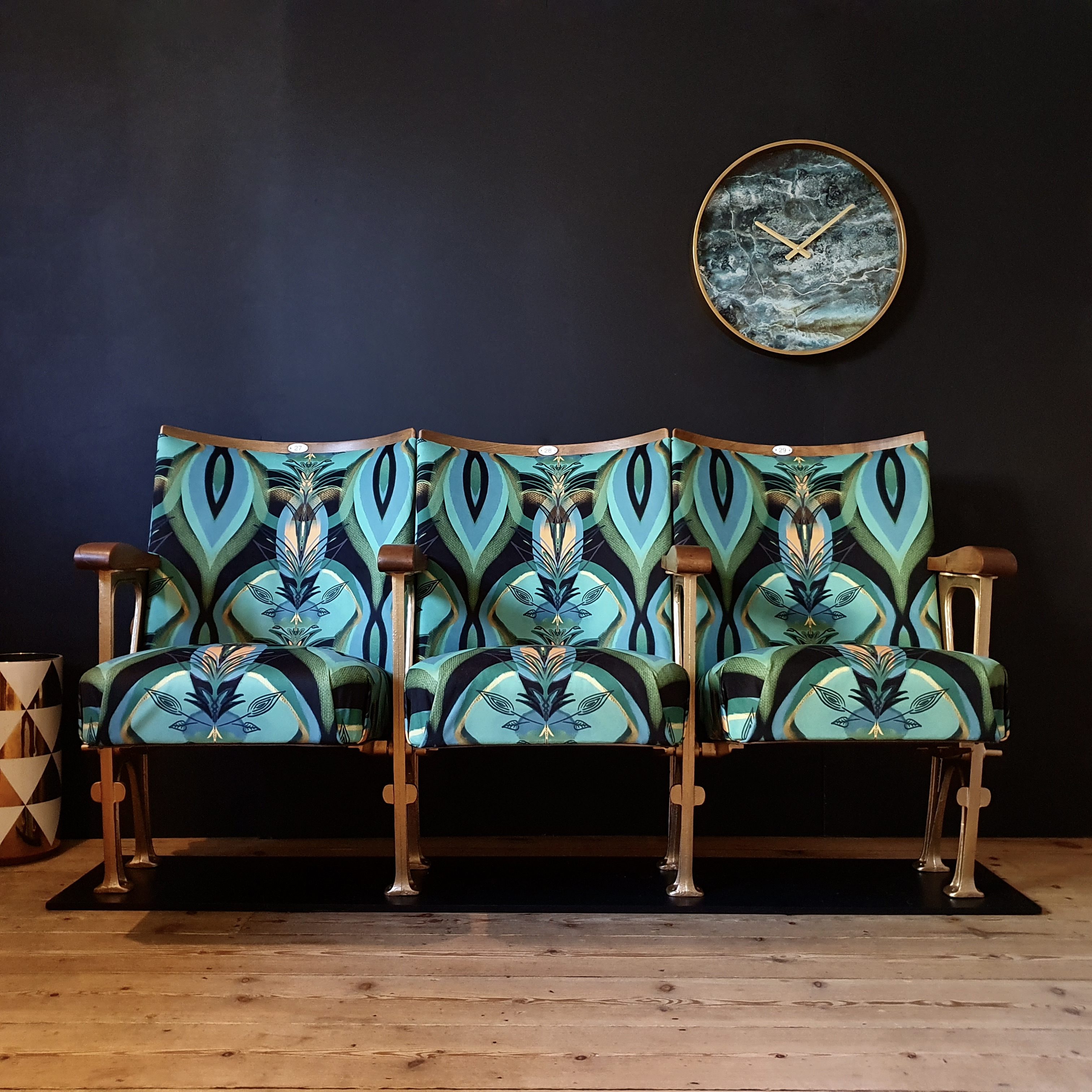 – We love using soft velvets on these cinema seats. It’s a nod to their past but updated with a contemporary design. All the velvets we recommend will be suitable for upholstery with the appropriate fire resistant treatment.