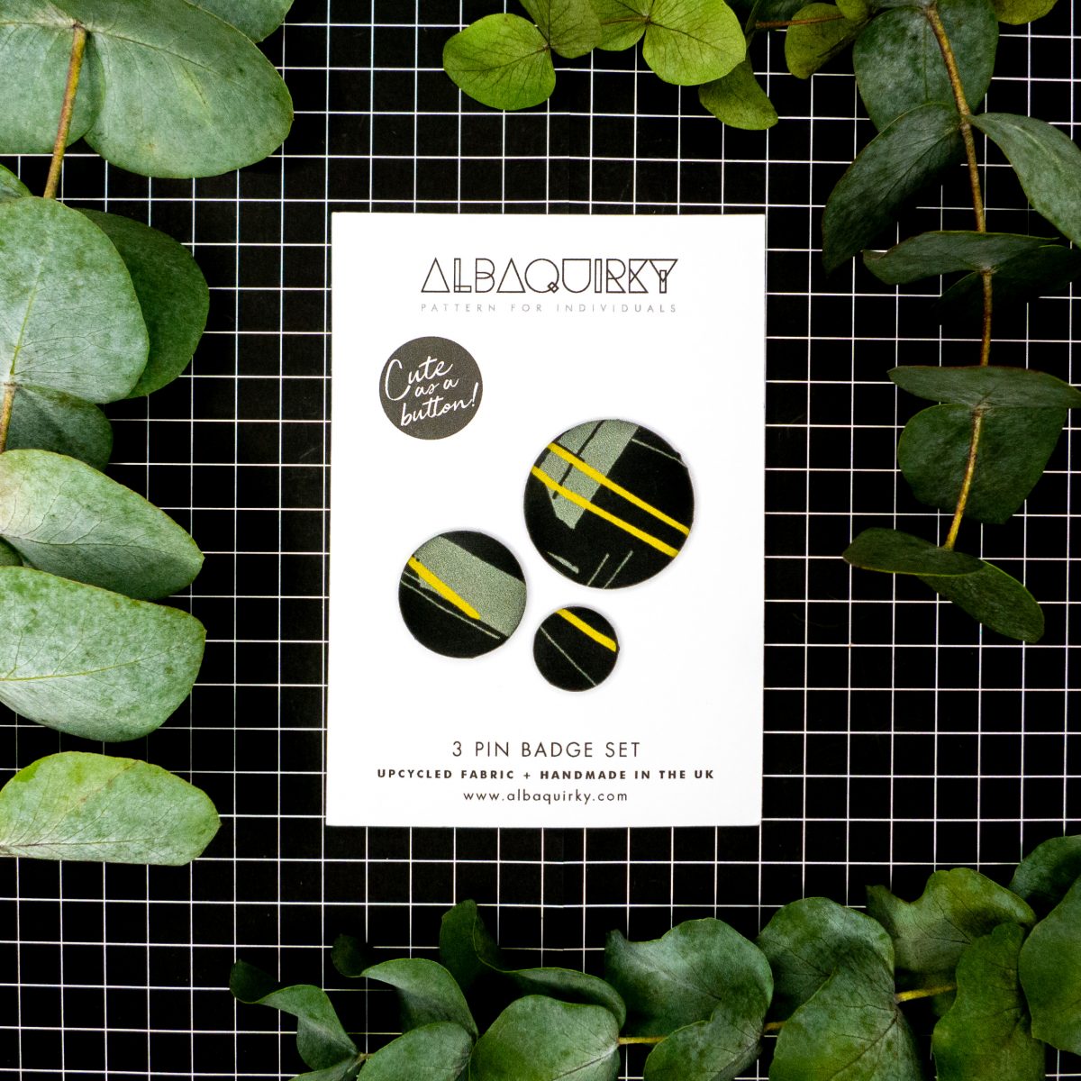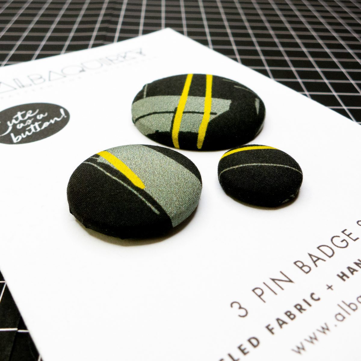 Each set of badges is made from recycled swatches of silk-cotton fabric – drawn, designed and 100% handmade by me. Each set takes around an hour to create, from cutting the fabric and lining, making the buttons, and assembling the badges.