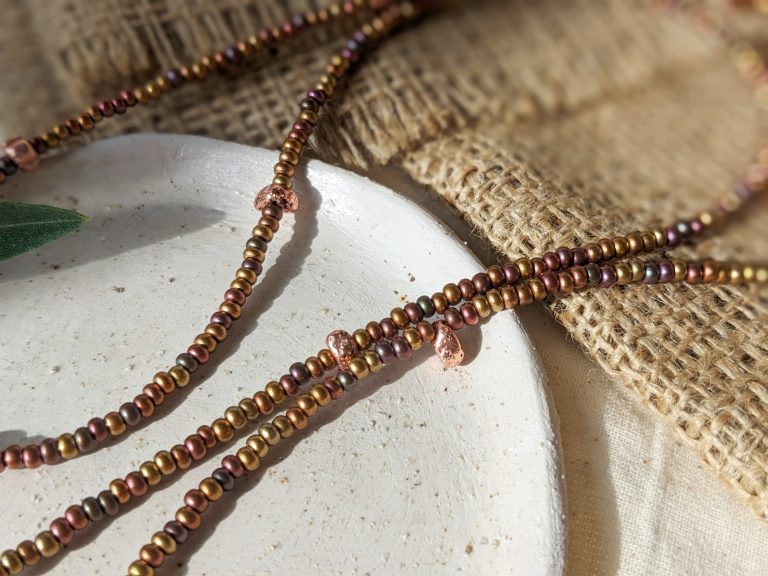 The chain is crafted with Czech Matte Metallic Gold Iris Rocaille seed beads, offering a stunning combination of matte and metallic finishes. Alternating with the seed beads are rustic rose gold-coloured lava beads (6x4mm), adding a unique, earthy texture to the design. These elements come together to create a beautiful contrast of shimmer and texture, perfect for those who love a subtle yet distinctive accessory.