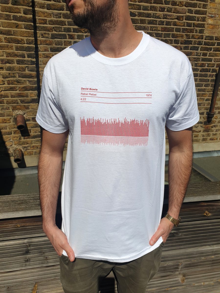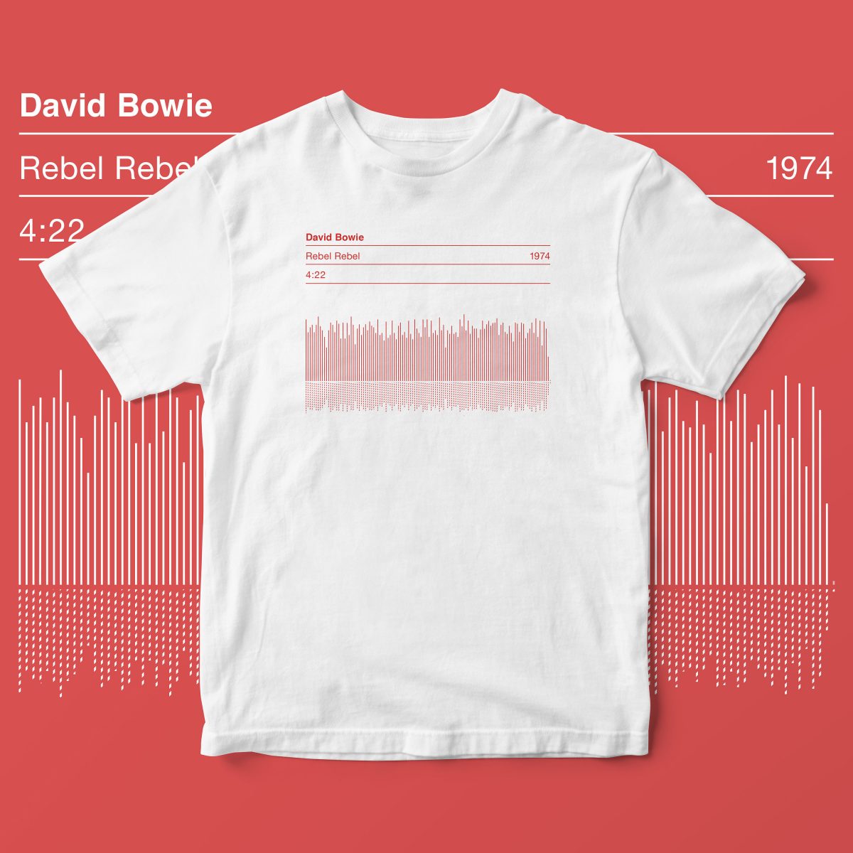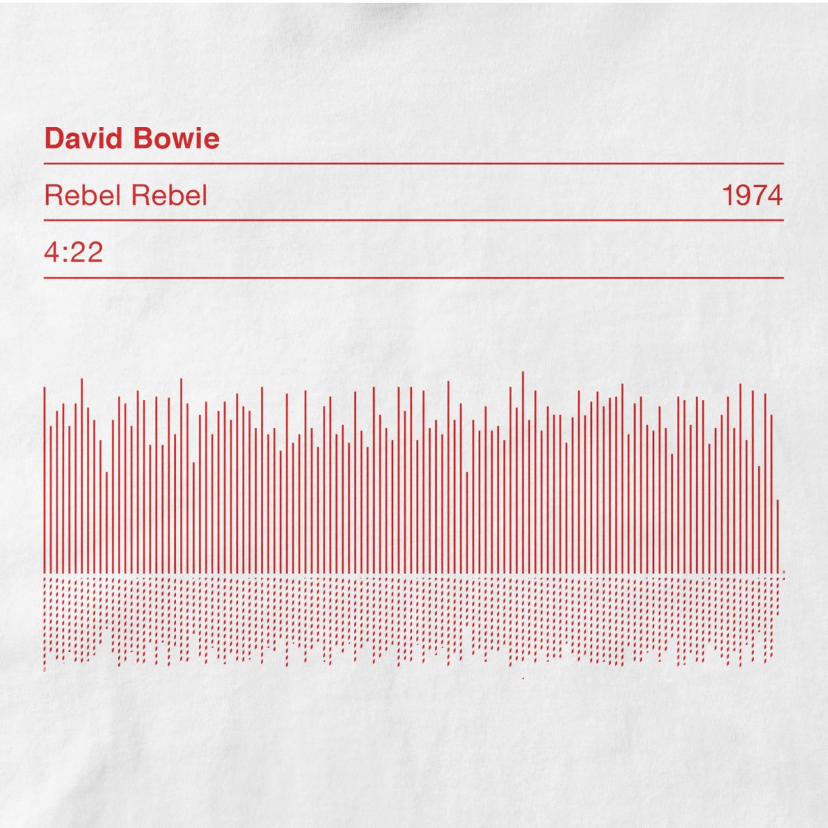 David Bowie Rebel Rebel Sound Wave T Shirt showcases an original Serigrafica7585 design, featuring a striking sound wave graphic with essential song details. The T shirt highlights the song title, length, and release date, celebrating the timeless impact of Rebel Rebel by David Bowie. Carefully designed, this piece remains a unique tribute to one of rock’s most iconic anthems. Crafted with precision, it brings together style, music, and history in one wearable piece.