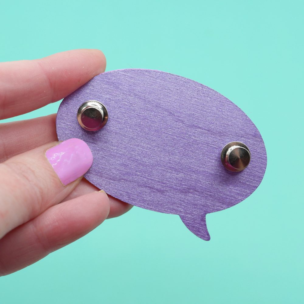 The brooch itself is crafted with care, starting with my custom-printed faux leather fabric, designed right here in my studio. The abstract pattern is soft and almost ethereal—like a daydream brought to life. Underneath, the sturdy birch plywood base has been hand-painted in a shimmering lavender shade. This gives the cut-out text a lovely purple shimmer. You can really see the paint effect with the reverse side in the third photo—it’s such a lovely detail that makes the design pop!