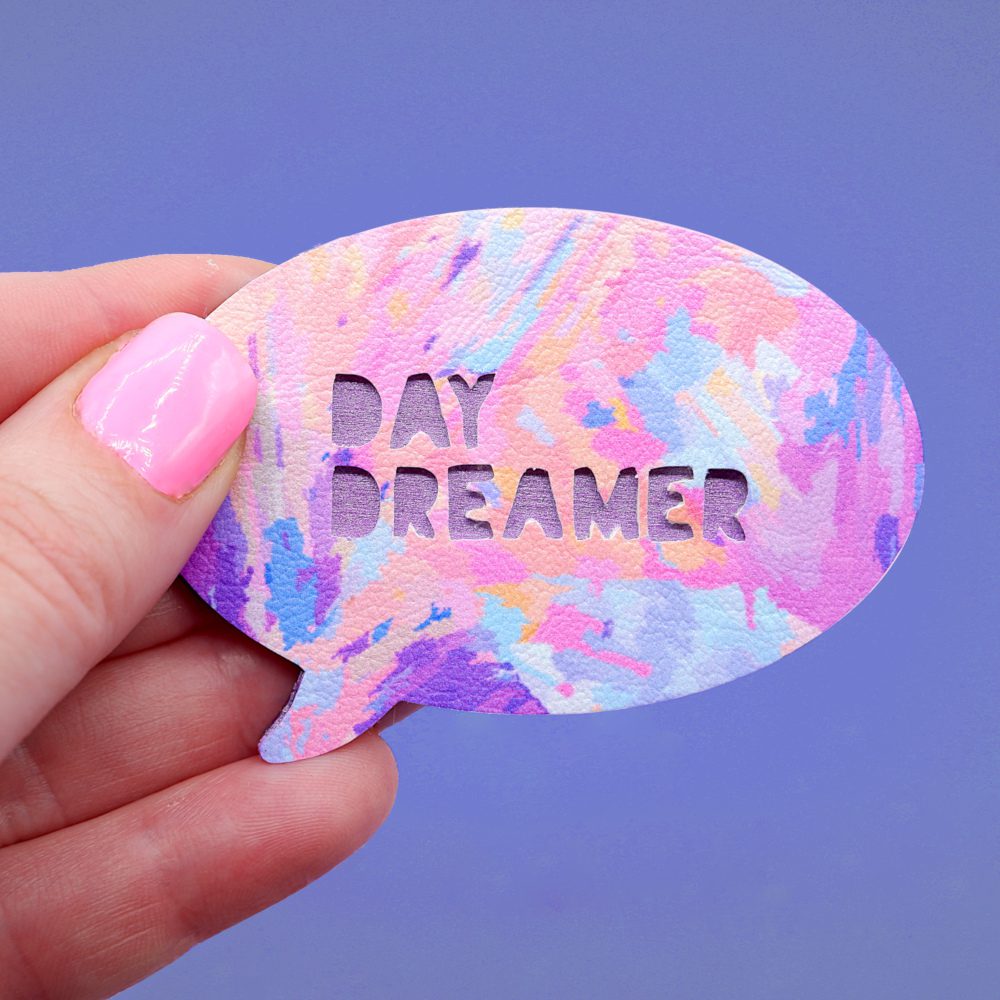 Bursting with soft, dreamy hues of pink, lilac, buttery yellow, and peach. This playful accessory is all about embracing your thoughtful side. The words ‘Day Dreamer’ are cut from my own original fabric design, revealing a peek of the stunning metallic lavender backing beneath. It’s a little wearable daydream, perfect for creatives, thinkers, and anyone who loves a whimsical twist to their outfit.